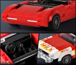 Dzięki realistycznym elementom, takim jak naklejki z płomieniami, pełne felgi, charakterystyczny przedni zderzak i dekoracyjny „chrom”, otrzymasz model o wyrazistym charakterze. W zestawie znajduje się także ilustrowana instrukcja oraz separator klocków dla wygodnego montażu.
