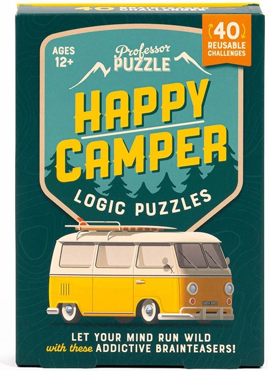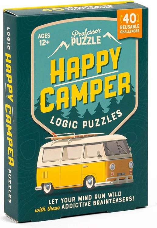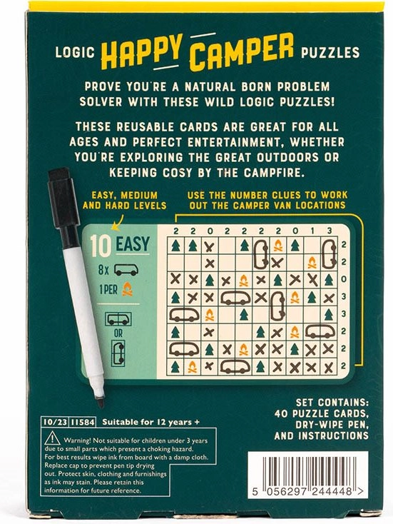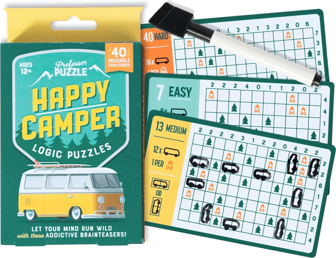Wyrusz na przygodę z zestawem Happy Camper Logic Puzzles marki PROFESSOR PUZZLE. Poręczne, wielokrotnego użytku karty oferują 40 sprytnych wyzwań na różnych poziomach trudności – od łatwych po wymagające. Dzięki pisakowi suchościeralnemu możesz pisać i rozwiązywać bezpośrednio na kartach, łatwo wszystko zmazać i zacząć od nowa.