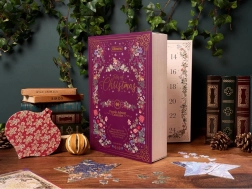 Elegancki kalendarz „book-style” z bogatą świąteczną grafiką i 24 perforowanymi drzwiczkami na codzienną niespodziankę.
