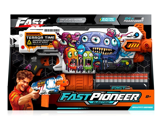 Przeżyj pełną akcji zabawę z elektrycznym blasterem Fast Pioneer, który zapewnia szybkie i płynne strzelanie po naciśnięciu spustu. W zestawie znajdziesz 24 miękkie piankowe naboje do bezpiecznej zabawy w domu i na zewnątrz. Dzięki wytrzymałej i bezpiecznej konstrukcji oraz łatwej obsłudze to idealny wybór dla dzieci od 8 lat.
