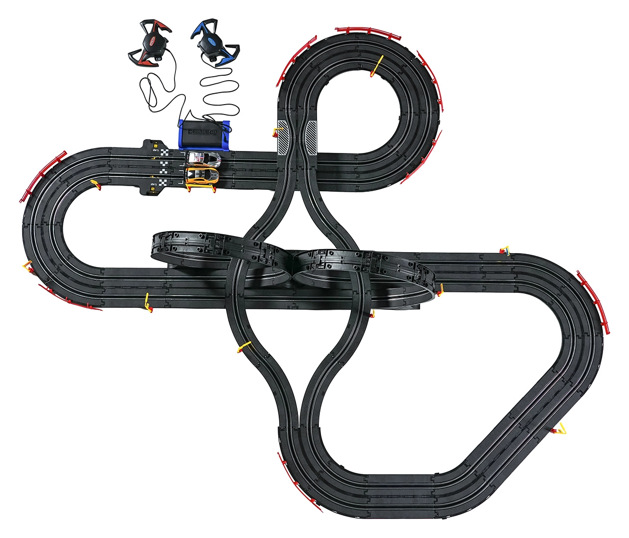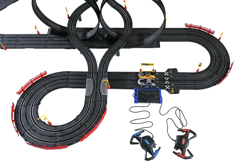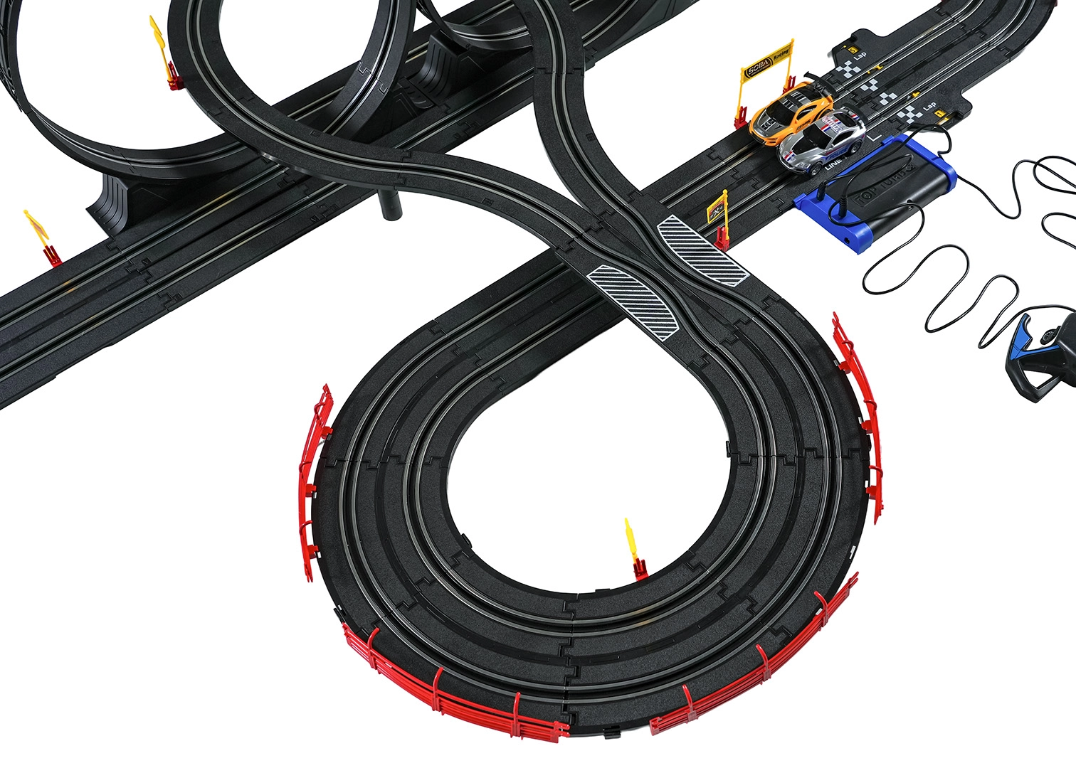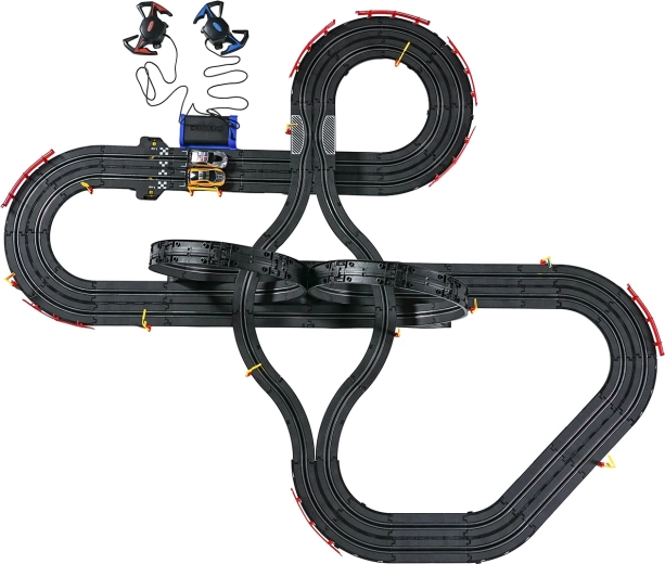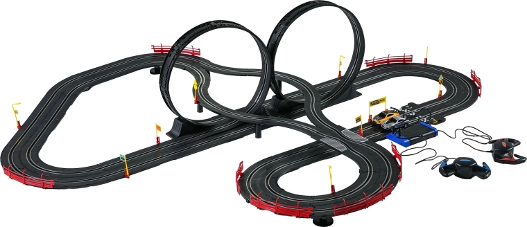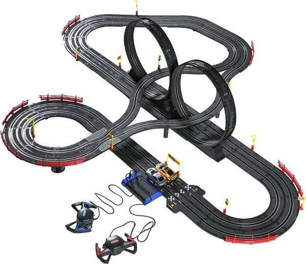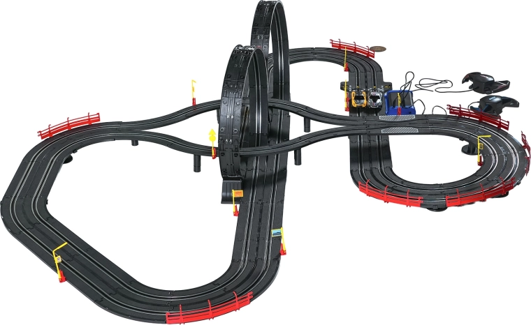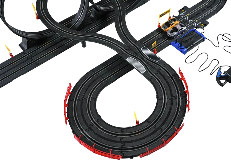 Modułowe elementy z bandami bezpieczeństwa zapewniają stabilną jazdę nawet w najszybszych partiach. Dwa kontrolery można podłączyć do bazy lub zasilać bateriami, dzięki czemu masz swobodę ścigania się na własnych zasadach. Dzięki długiej trasie jest przestrzeń na wyprzedzanie, taktyczną jazdę i dramatyczne finisze.