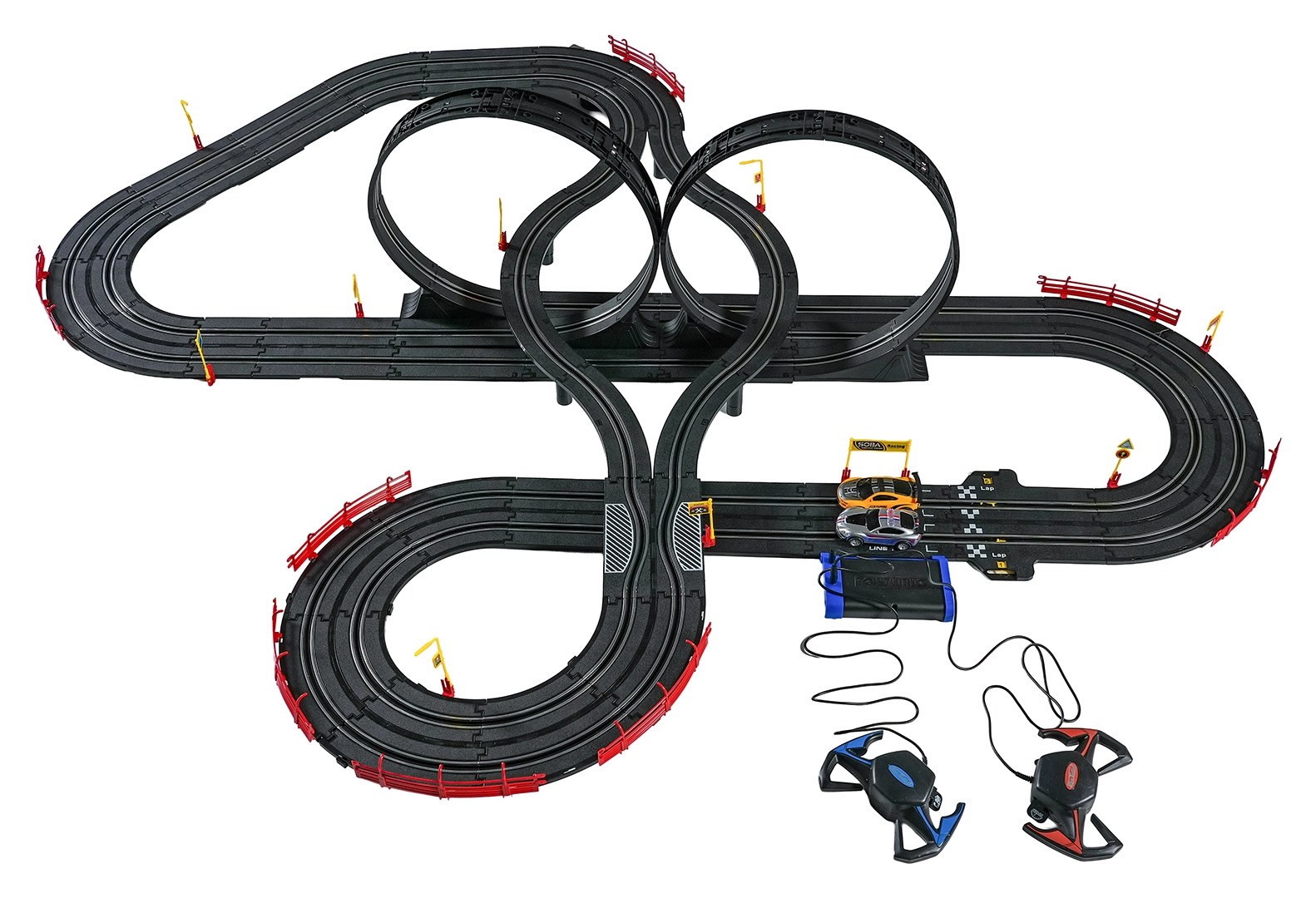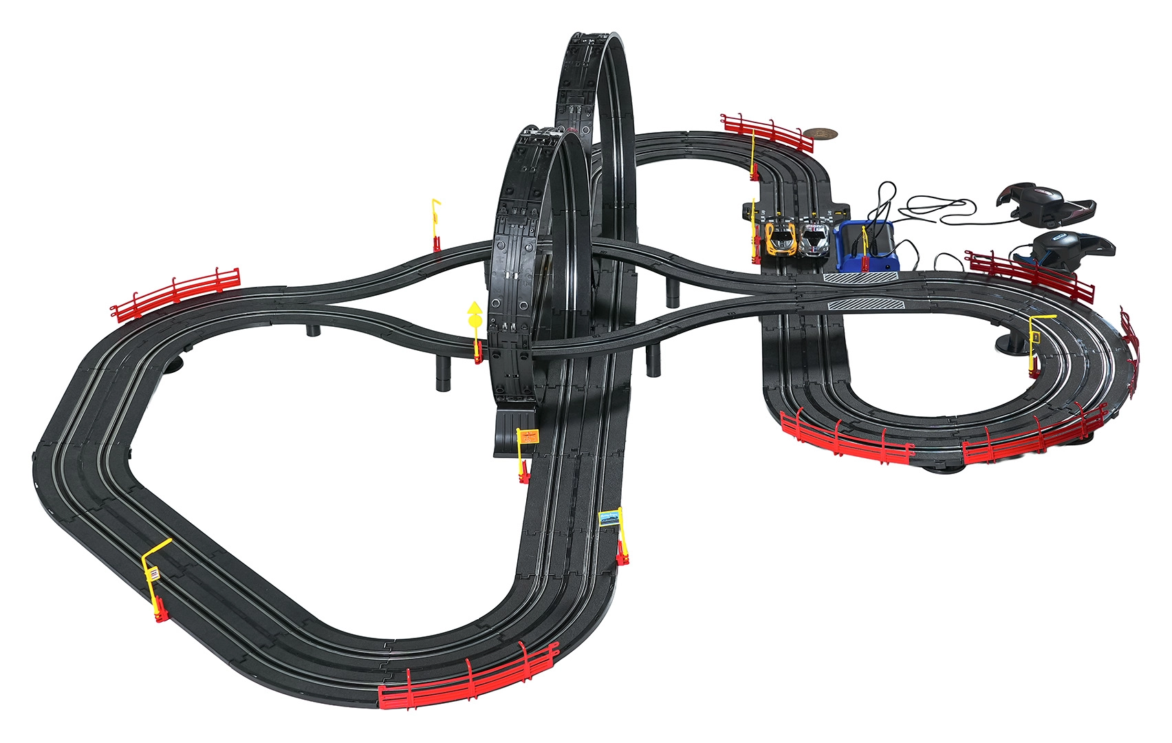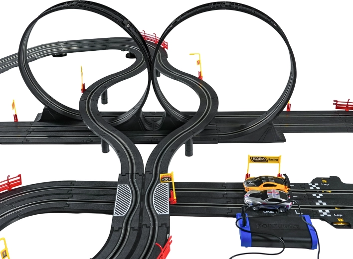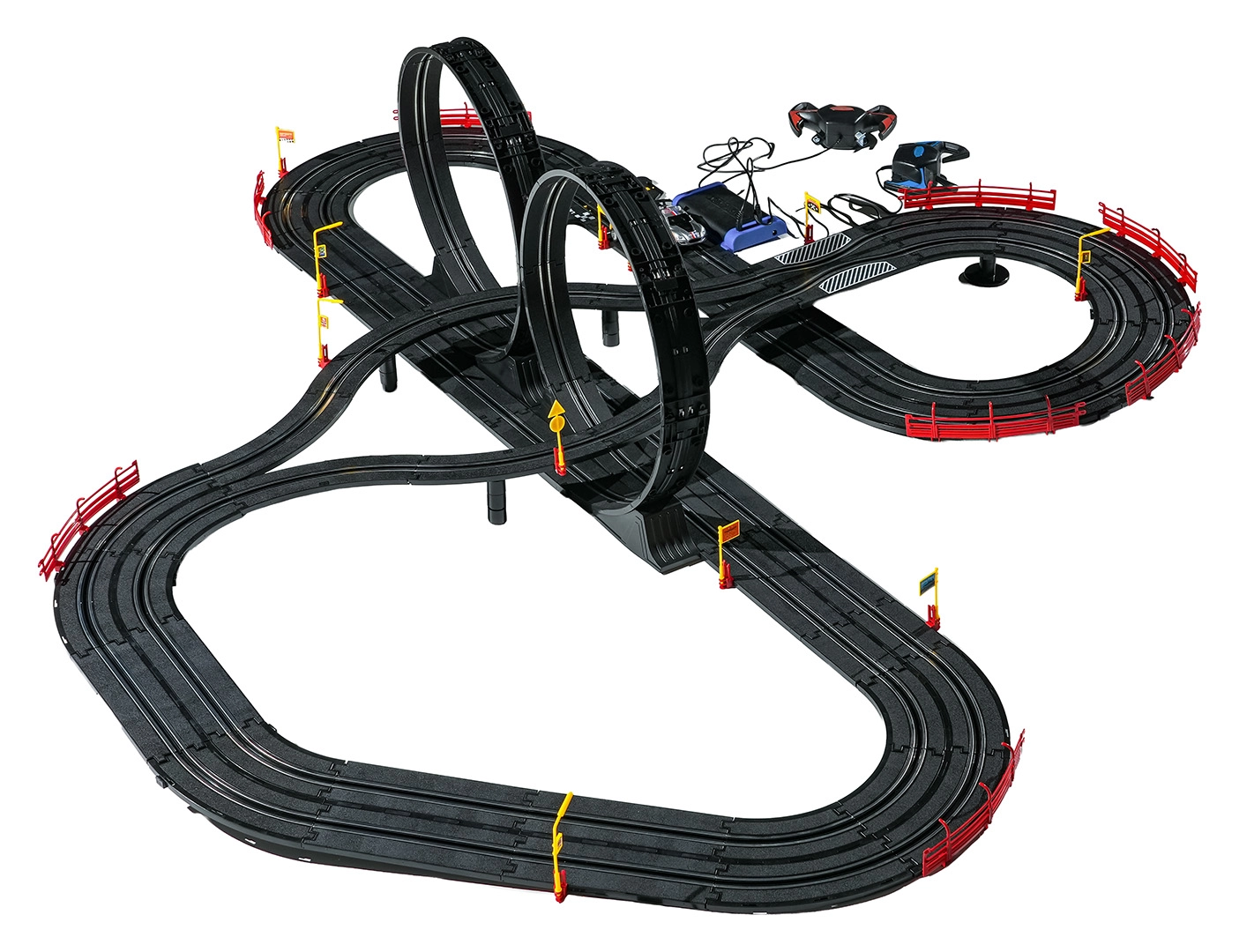 Ogromny elektryczny tor wyścigowy dla dwóch graczy o długości aż 790 cm oferuje podwójne loopingi, ostre zakręty i długie proste dla emocjonujących pojedynków. W zestawie znajdują się 2 samochody wyścigowe ze świetlnymi efektami oraz 2 kontrolery w kształcie kierownicy. Tor można zasilać zasilaczem 12 V (w zestawie) lub bateriami, więc możesz ścigać się kiedy chcesz i gdzie chcesz.