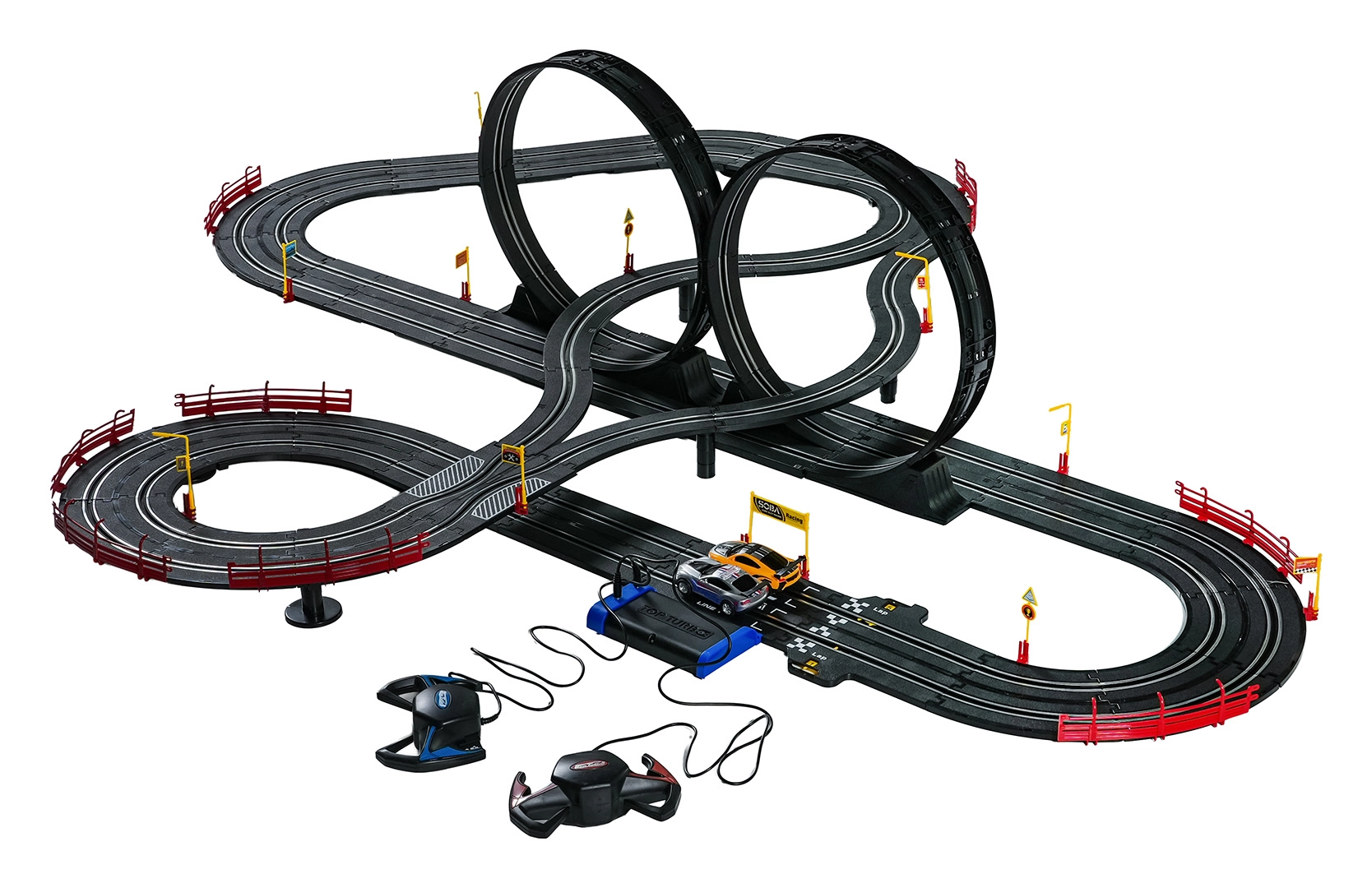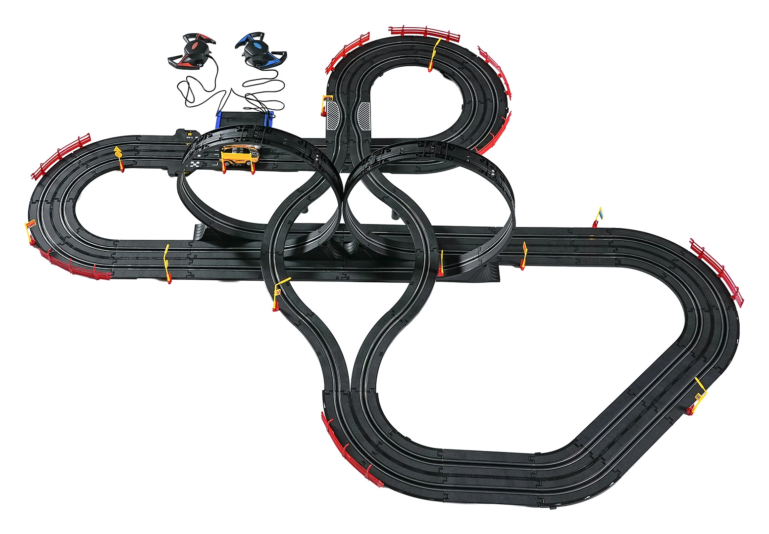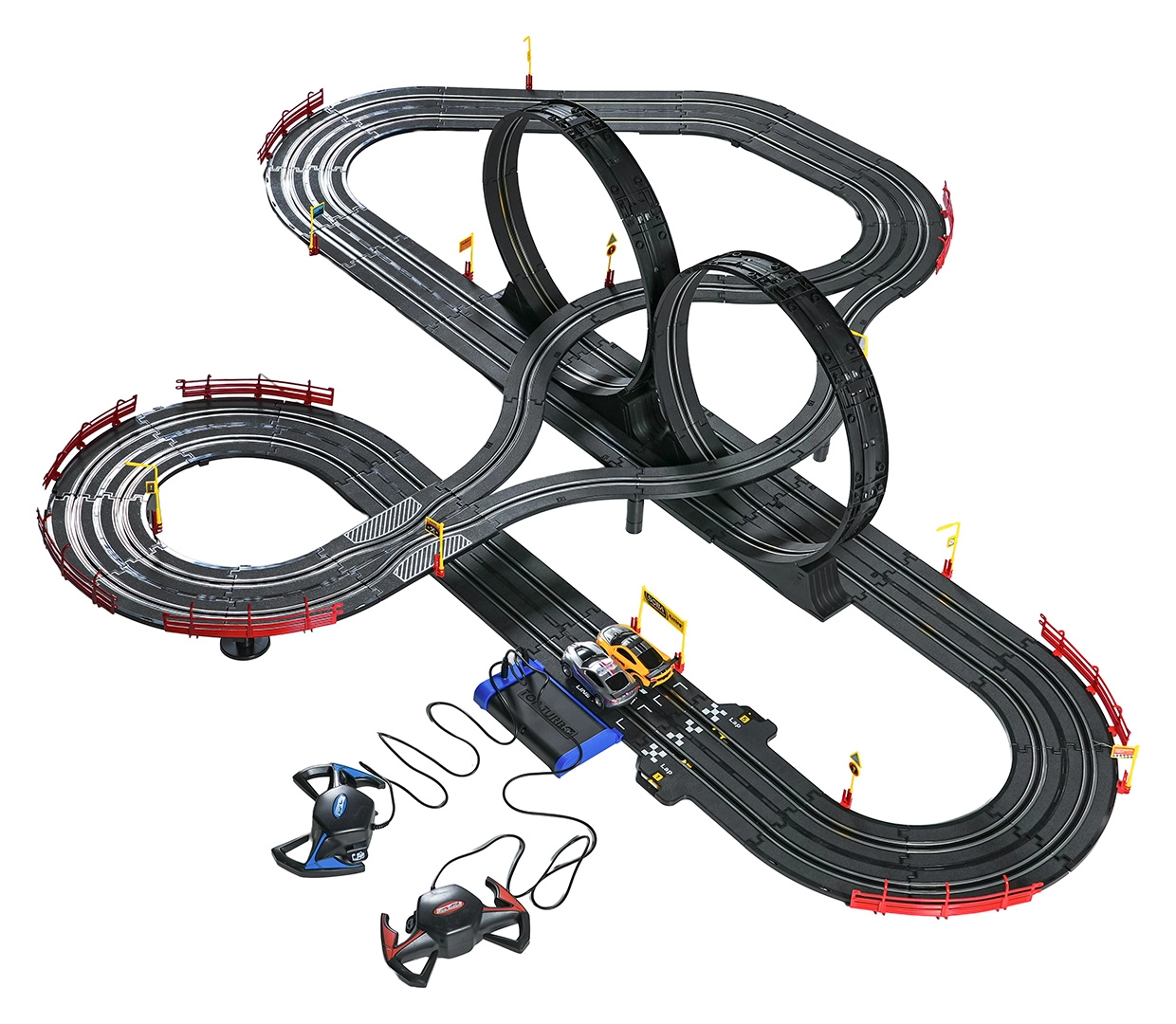 Ogromny elektryczny tor wyścigowy dla dwóch graczy o długości aż 790 cm oferuje podwójne loopingi, ostre zakręty i długie proste dla emocjonujących pojedynków. W zestawie znajdują się 2 samochody wyścigowe ze świetlnymi efektami oraz 2 kontrolery w kształcie kierownicy. Tor można zasilać zasilaczem 12 V (w zestawie) lub bateriami, więc możesz ścigać się kiedy chcesz i gdzie chcesz.