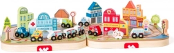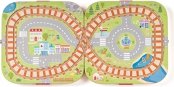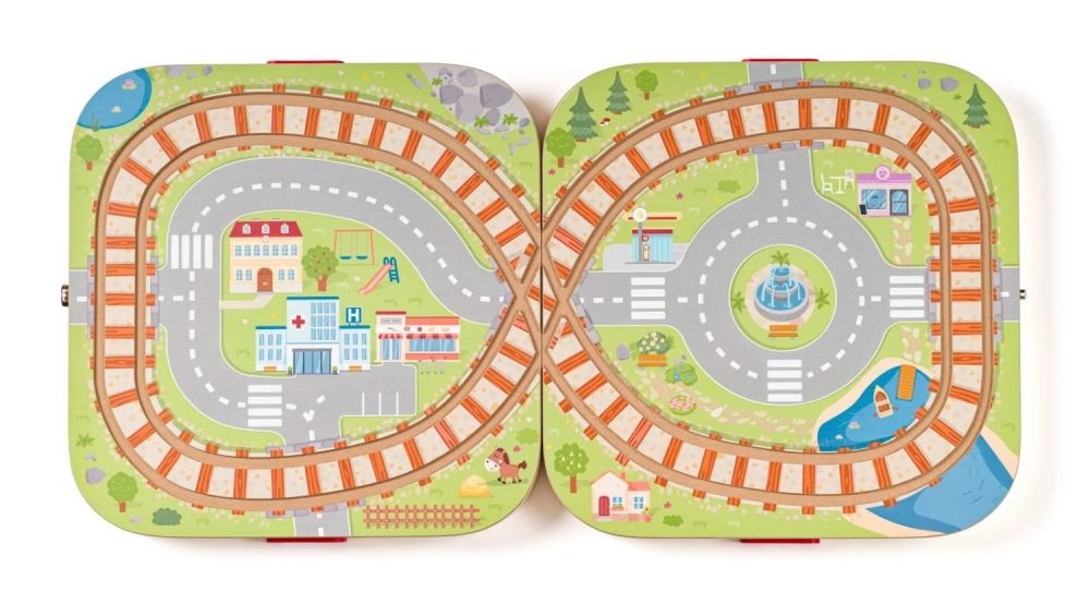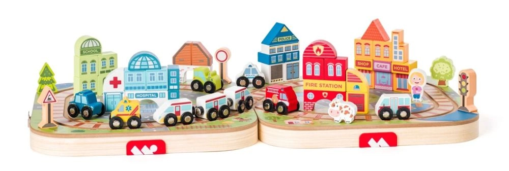 Ten drewniany zestaw miasteczka w walizce jest idealny dla małych odkrywców. Po otwarciu otrzymujesz kompletne scenki miejskie ze szpitalem, remizą strażacką, szkołą czy komisariatem policji, drogami, znakami drogowymi, drzewkami i zwierzątkami. W zestawie znajdują się również drewniane pojazdy na kółkach – karetka, wóz strażacki, radiowóz, autobus czy traktor – oraz trzywagonowa kolejka z magnetycznym łączeniem.