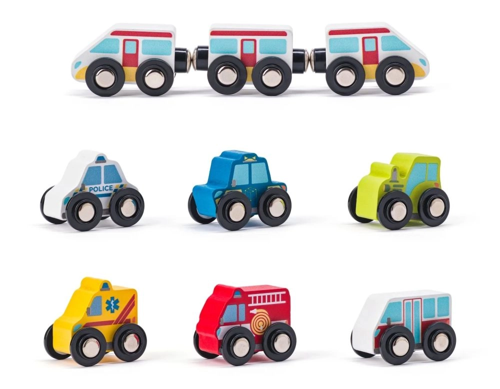 Karetka, wóz strażacki, autobus, traktor i inne poruszają się płynnie po drogach. Trzywagonowa kolejka łączy się magnesami dla łatwiejszego ciągnięcia i pchania.