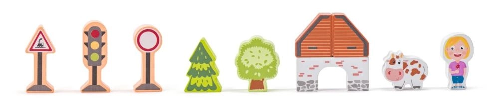 Dzięki składanej formie zestaw świetnie sprawdzi się w domu i w podróży. Dzieci poćwiczą logiczne myślenie, koordynację ręka–oko i poznają podstawy zasad ruchu drogowego w bezpiecznym środowisku zabawy. Drewniane elementy są przyjemne w dotyku, trwałe i kolorowe.