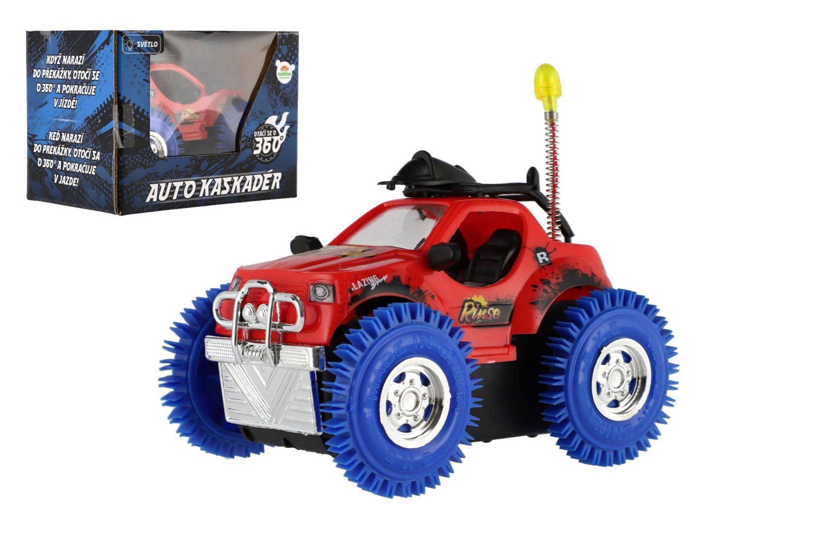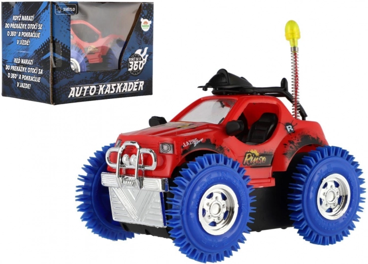 Świetne kaskaderskie auto dla małych rajdowców, które przy zderzeniu wykonuje obrót o 360° i jedzie dalej. Oferuje efekty świetlne i dźwiękowe, wytrzymałą plastikową konstrukcję oraz solidne koła dla doskonałych właściwości jezdnych. Zasilanie zapewniają 3× baterie AA. Odpowiednie dla dzieci od 3 lat.