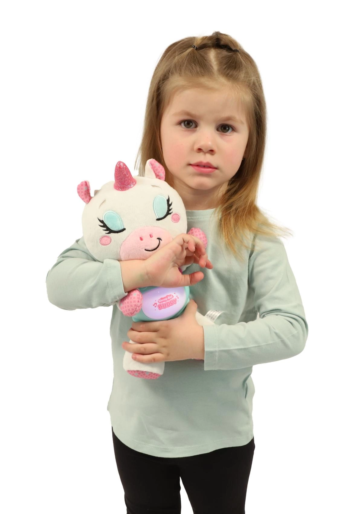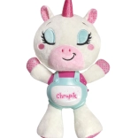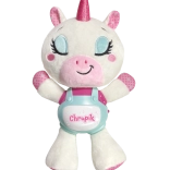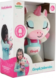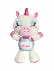 Podaruj dziecku spokojne wieczory z usypianką jednorożcem Chrupíkiem. Miękki pluszowy przyjaciel z wbudowanym plastikowym panelem oferuje delikatne światło i kojące melodie, które wprowadzają przyjemny nastrój podczas zasypiania. Prosta obsługa jednym przyciskiem ułatwia korzystanie nawet jedną ręką.