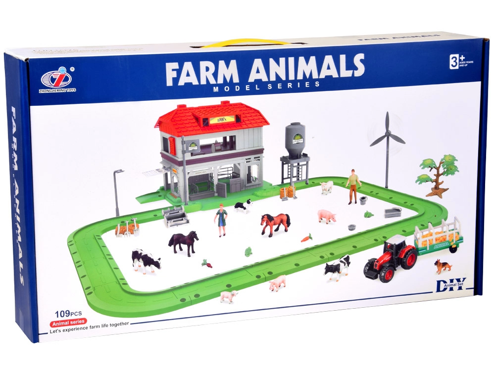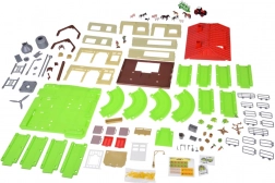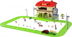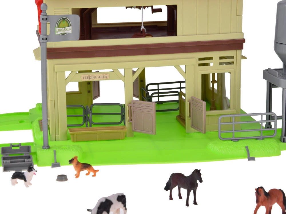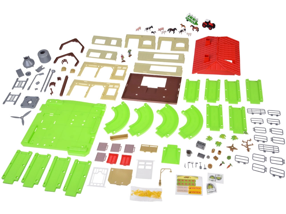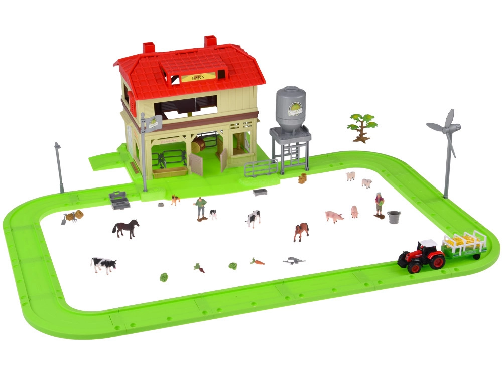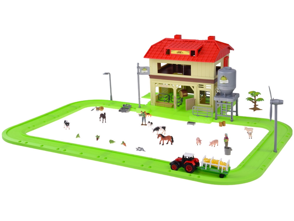 Ten rozbudowany zestaw zamieni pokój dziecięcy w małą wieś. Dzieci mogą karmić zwierzęta, wozić siano traktorem z przyczepą, otwierać dach stodoły dla łatwego dostępu do środka oraz używać silosa do wsypywania i wysypywania paszy. Zielony tor/pętla łączy wszystkie części farmy w jedną, pełną zabawy scenę.