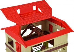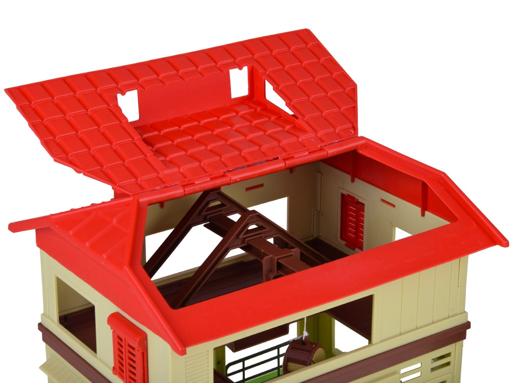 Stodołę z czerwoną dachówką można otworzyć, aby łatwo aranżować wnętrze. Ruchoma korbka dodaje autentyczności i wspiera motorykę małą.