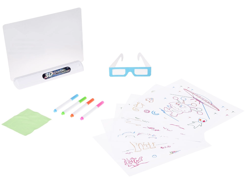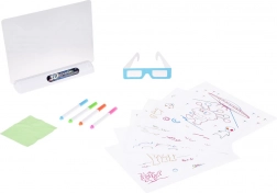 Przezroczysta tablica z podświetleniem LED rozjaśnia ślady markerów. Po założeniu okularów 3D rysunki zyskują realistyczną przestrzenność i efekt wow.