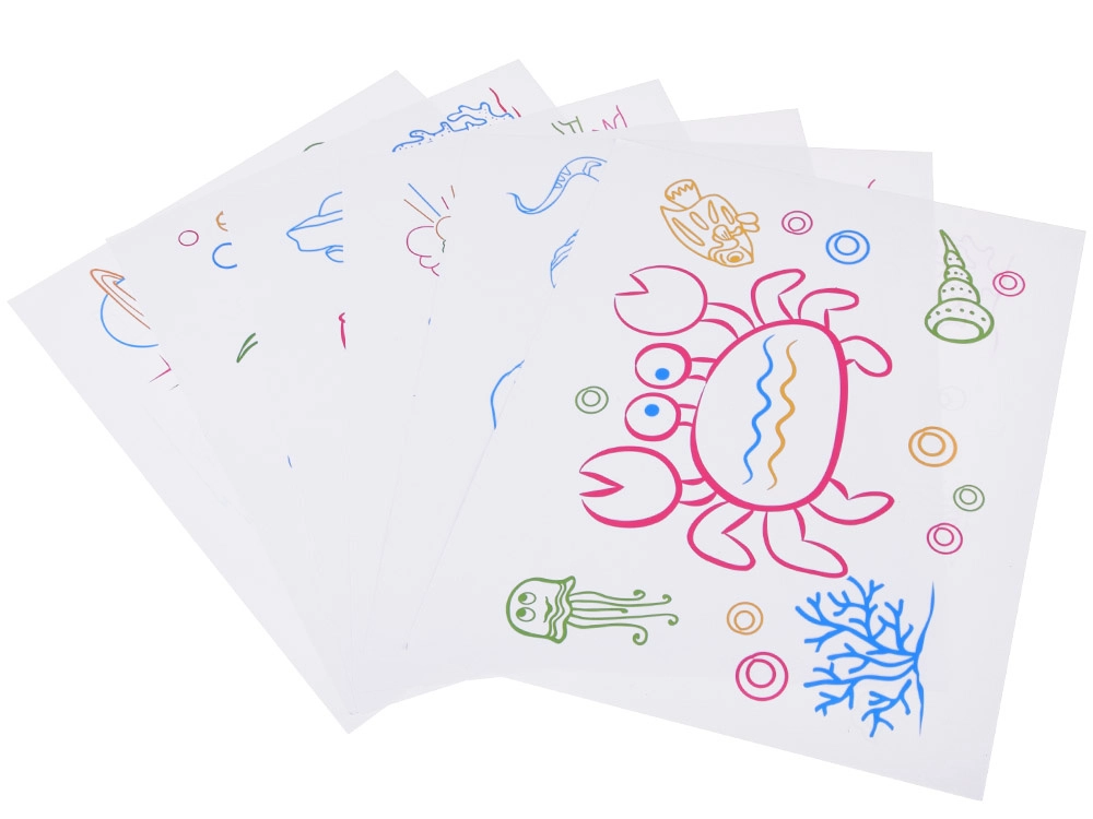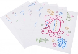 W zestawie znajdują się dwustronne szablony z motywami morskimi. Dzieci mogą wsunąć je za panel i wygodnie odrysować pierwsze obrazki.
