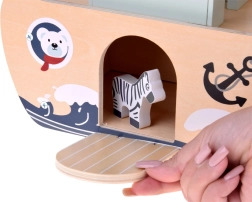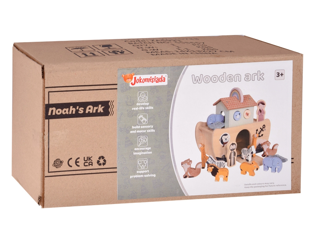 Arka ma otwierane elementy, rampę i otwory, przez które dzieci wkładają zwierzątka. W formie zabawy trenują małą motorykę i logiczne myślenie.