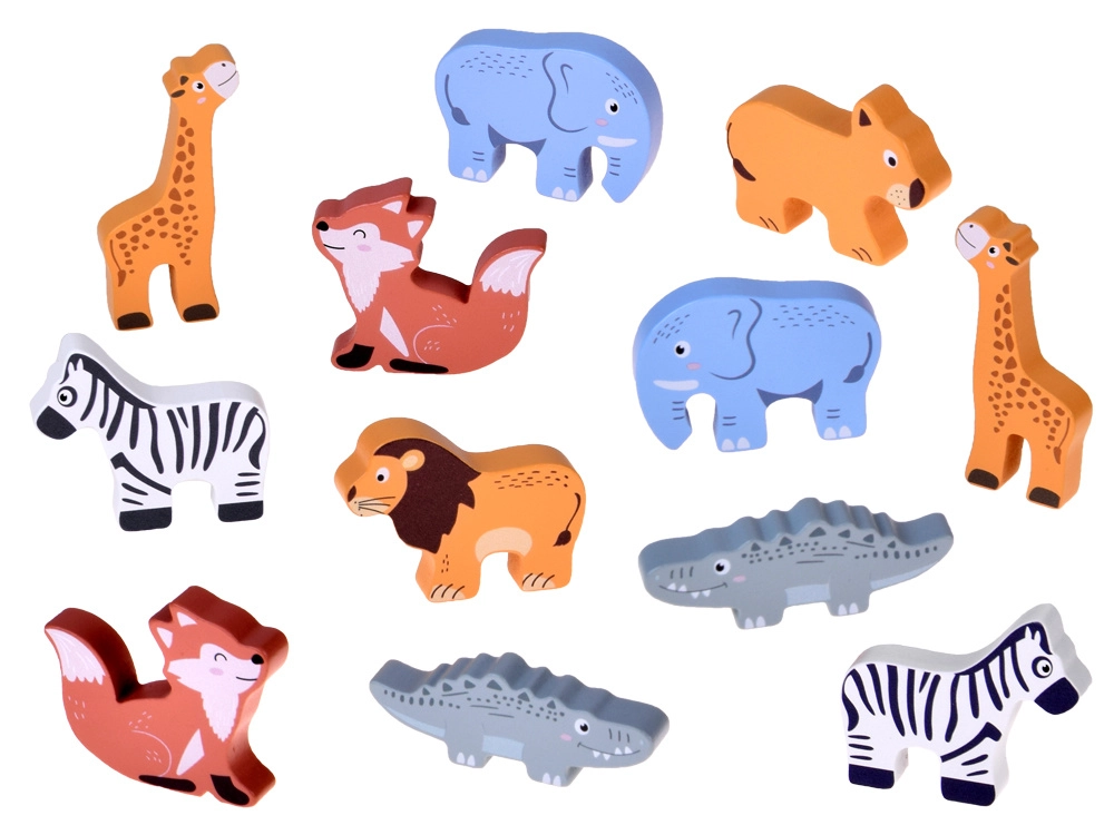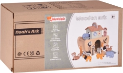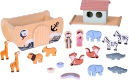 W zestawie pary zwierząt (słonie, zebry, żyrafy, lwy, lisy, krokodyle, ptaki) oraz dwie postacie – Noe i jego żona. Idealne do opowiadania historii i nauki nazw zwierząt.