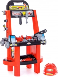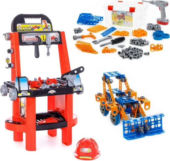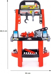 Zestaw dla małych majsterkowiczów obejmuje kompaktowy stół warsztatowy z półką pod blatem roboczym oraz haczykiem do zawieszania narzędzi w górnej części. W komplecie znajdują się śrubokręt, klucz francuski, płaskie elementy do przykręcania, śrubki i nakrętki, klucze do skręcania, imadło i kask ochronny. Do zestawu dołączono także komplet naklejek dla atrakcyjnego wyglądu całego warsztatu.