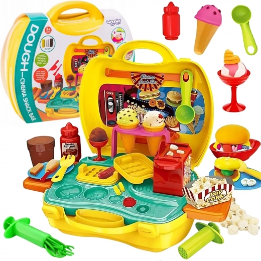 Dziecięcy zestaw marki WOOPIE zamienia zabawę w snack bar w fascynującą przygodę. W kompaktowej walizce znajdziesz bogaty zestaw akcesoriów, miękką, nietoksyczną modelinę oraz foremki na popcorn, frytki, hot dogi, hamburgery i lody. Dzięki łatwej obsłudze i bezpiecznym materiałom rozwija kreatywność, motorykę małą i wyobraźnię dzieci od 3 lat.