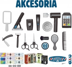 - prostownica do włosów, 2× nożyczki, grzebień, szczotka, lusterko, brzytwa, miseczka i pędzel do piany, podstawka pod prostownicę