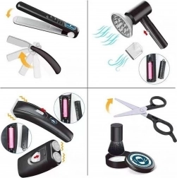 - Bogate wyposażenie 24 szt.: nasadki, nożyczki, grzebienie, prostownica, lusterko, brzytwa i inne.