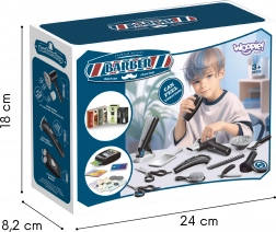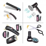 Zestaw zawiera wszystko, co potrzebne do pełnej pielęgnacji fryzjerskiej i barberskiej: od suszarki i prostownicy do włosów po maszynki, nożyczki, grzebienie i terminal płatniczy z pieniędzmi. Dzieci wypróbują obsługę klientów, płatność kartą i gotówką oraz nauczą się podstaw komunikacji i współpracy.