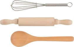 Praktyczny regulowany fartuch z kieszonką, czapka oraz wyściełana rękawica z podkładką uzupełnione są prawdziwymi akcesoriami: drewnianym wałkiem, drewnianą łyżką i metalową trzepaczką. Zestaw jest lekki, wygodny i dzięki wysokiej jakości tkaninie łatwy w utrzymaniu.