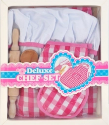 Fartuch, czapka, rękawica i podkładka plus drewniany wałek, łyżka i metalowa trzepaczka – wszystko, czego dziecko potrzebuje do bezpiecznej i wesołej zabawy w gotowanie.