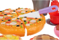 Segmenty pizzy są połączone rzepem – dzieci mogą je rozdzielać plastikowym nożem i z powrotem łączyć. Realistyczna zabawa bez bałaganu wspiera małą motorykę.