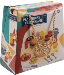 Pizza, radełko do pizzy, nóż, 2× hot dog, hamburger (bułka, sałata, kotlet), frytki, keczup, kubek ze słomką, dzbanek, 2× filiżanka ze spodkiem, desery (babeczka, donut, pączek, 3× ciasteczko), sztućce (łyżka, nóż, widelec), naczynia, instrukcja