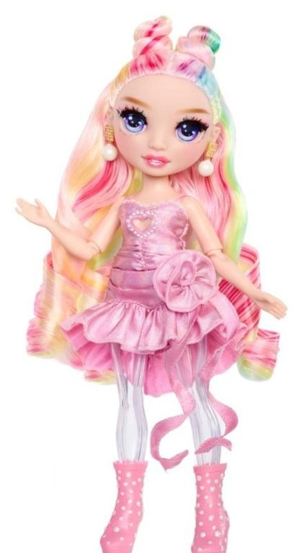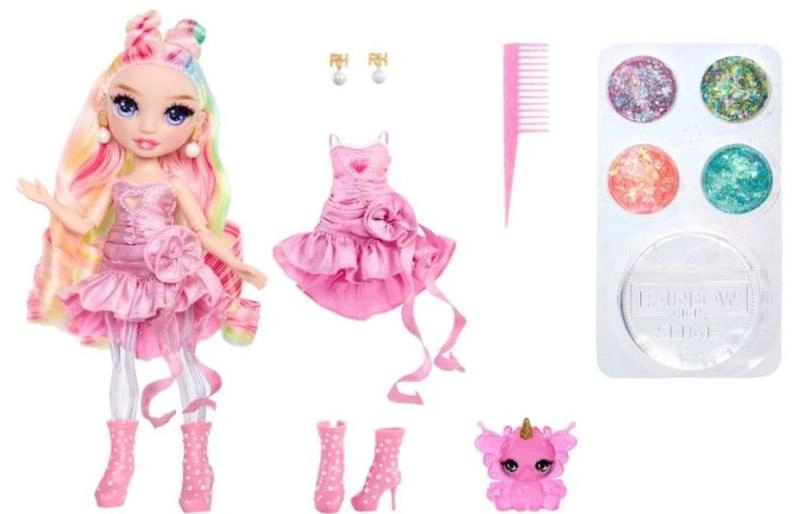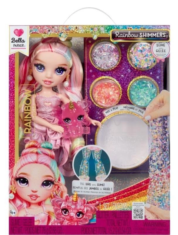 Lalka Rainbow High Bella wprowadza nowy sposób zabawy: łącz slime i brokat, zmieniaj wygląd i twórz błyszczące efekty w przezroczystych nogach lalki. Dzięki długim, wielokolorowym włosom, różowemu outfitowi i dodatkom czeka Cię mnóstwo modowych i kreatywnych scenariuszy.