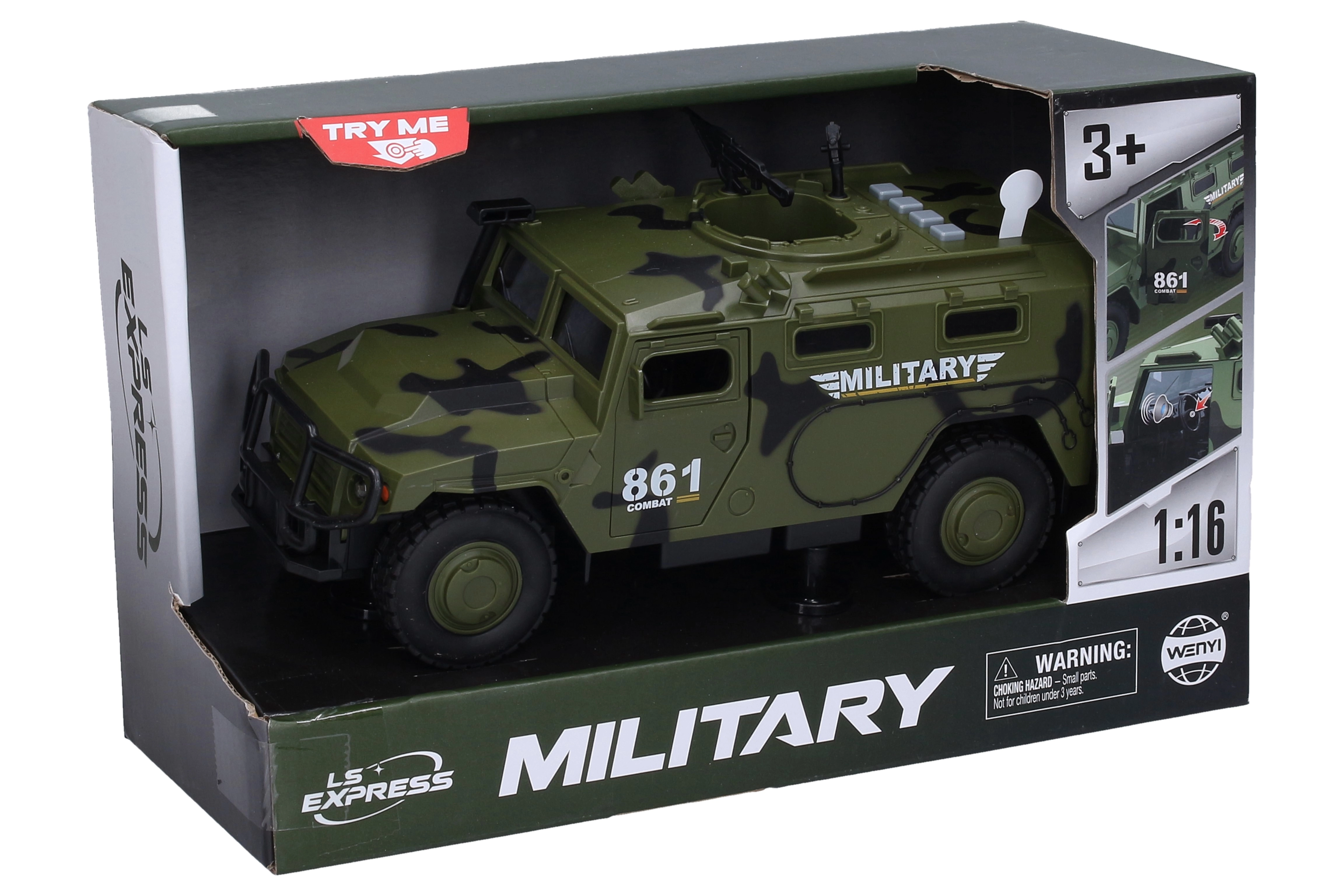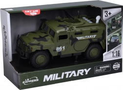 Spraw radość małym miłośnikom techniki wojskowej dopracowanym w detalach wojskowym autem. Dzięki napędowi ciernemu wystarczy popchnąć, a pojazd ruszy sam. Przyciski na dachu aktywują efektowne światła i dźwięki, które uatrakcyjnią zabawę i pobudzą wyobraźnię.