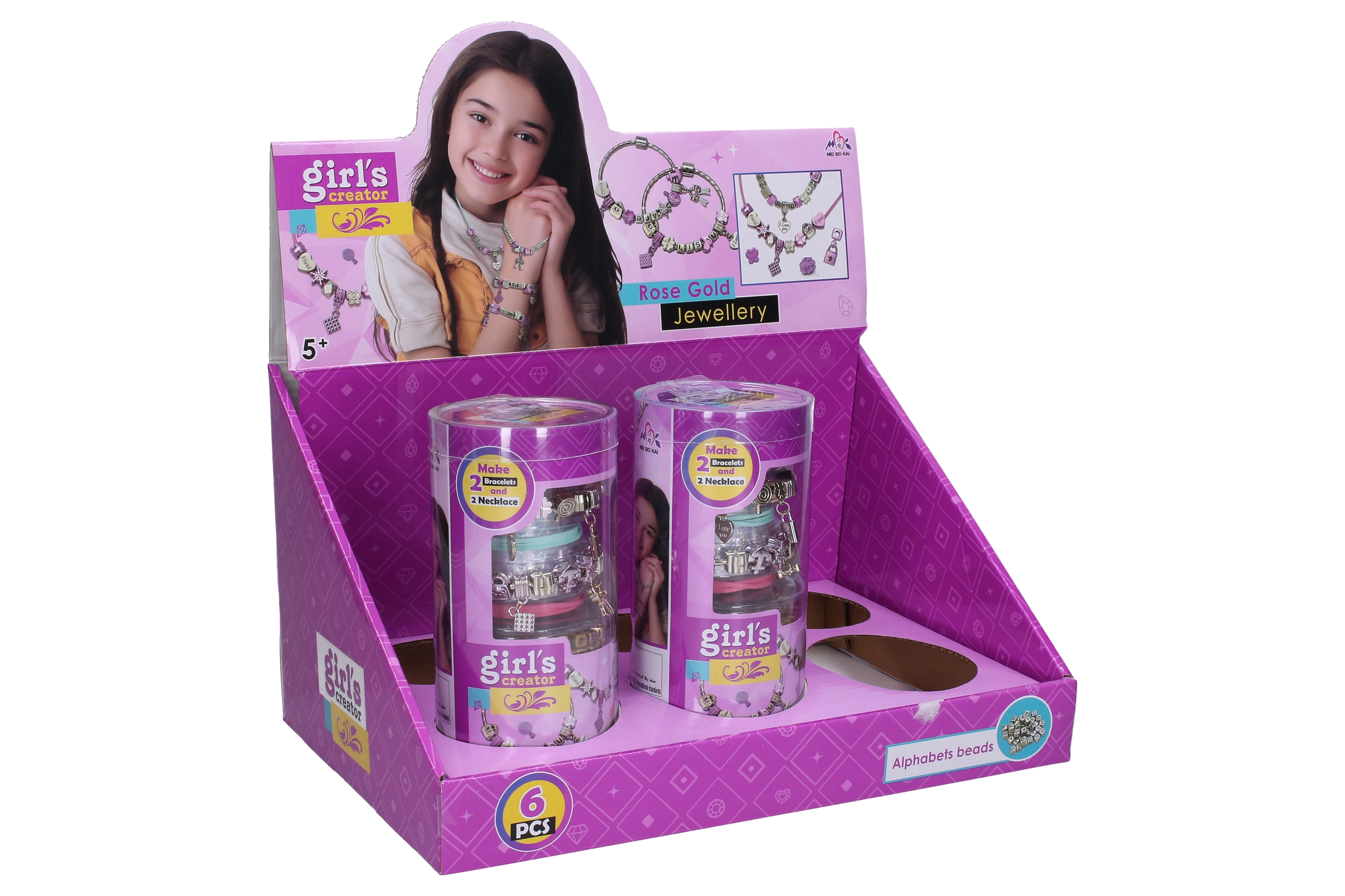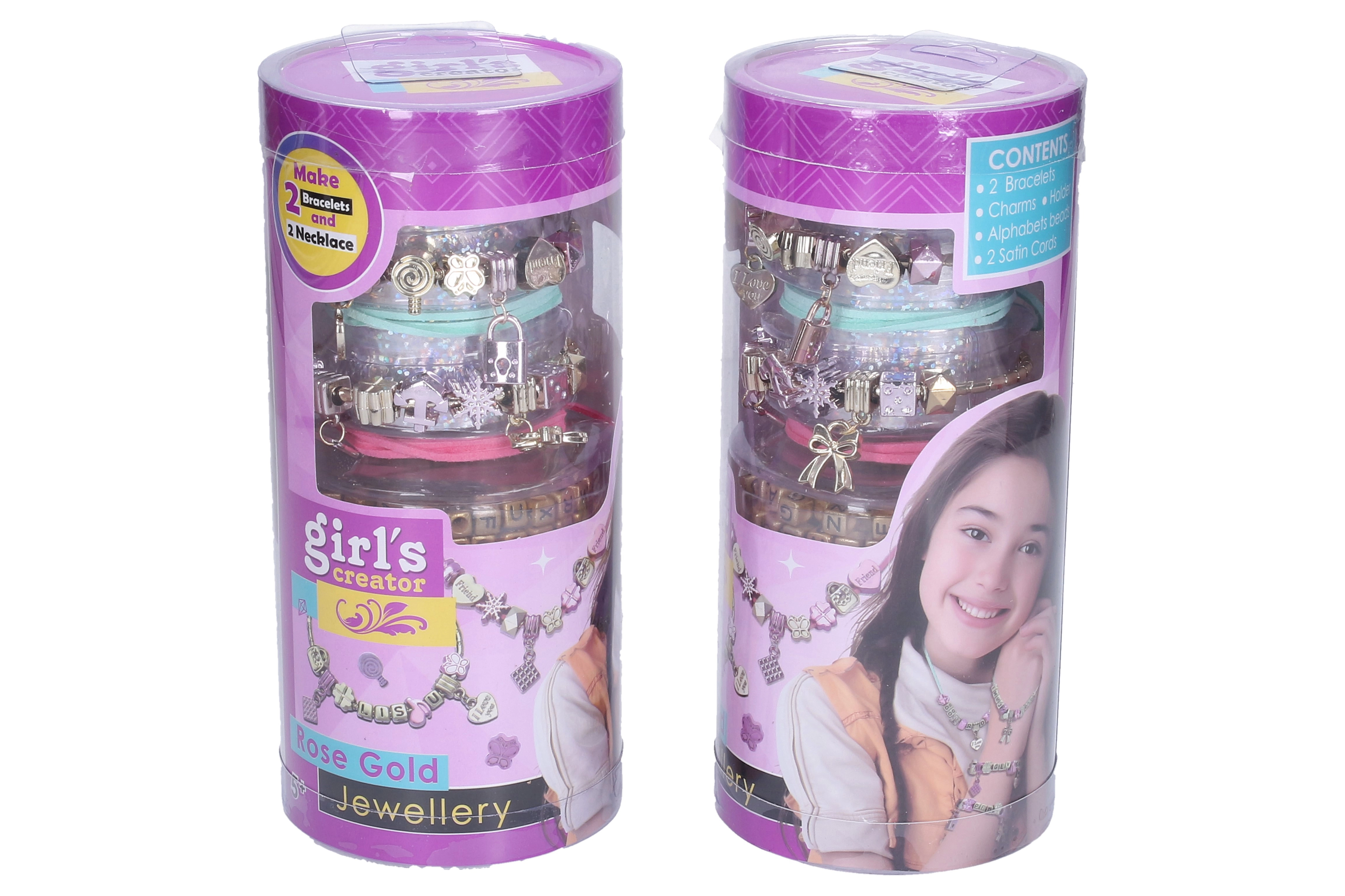 Ten kreatywny zestaw zachwyci wszystkie małe projektantki biżuterii. W opakowaniu znajdziesz wszystko, co potrzebne do wykonania stylowych bransoletek i naszyjników w eleganckim odcieniu rose gold – od zawieszek w kształcie serduszek, gwiazdek i kokardek po koraliki z literkami do tworzenia imion i wiadomości.