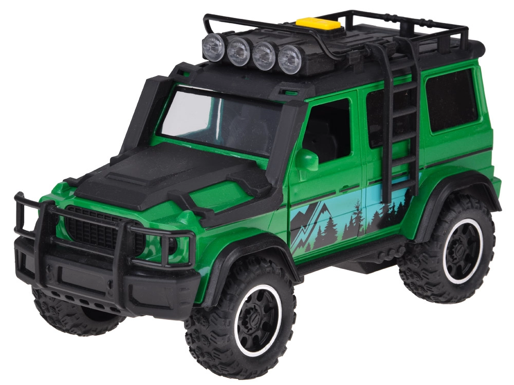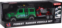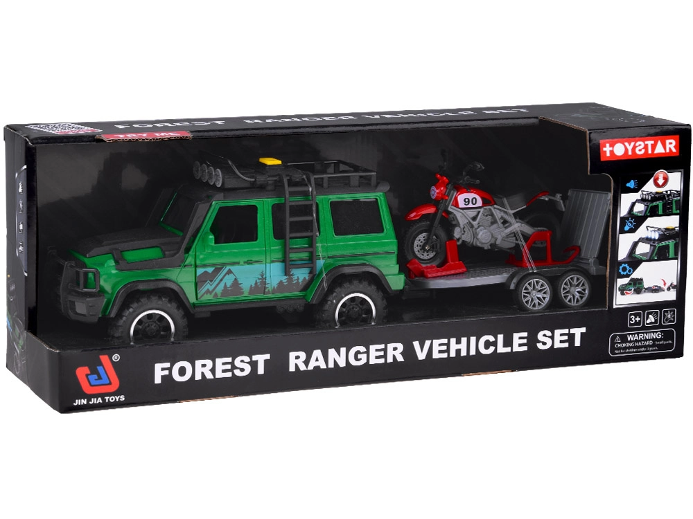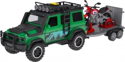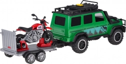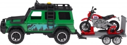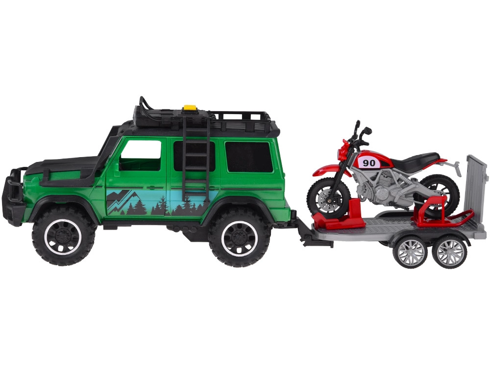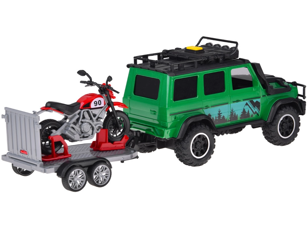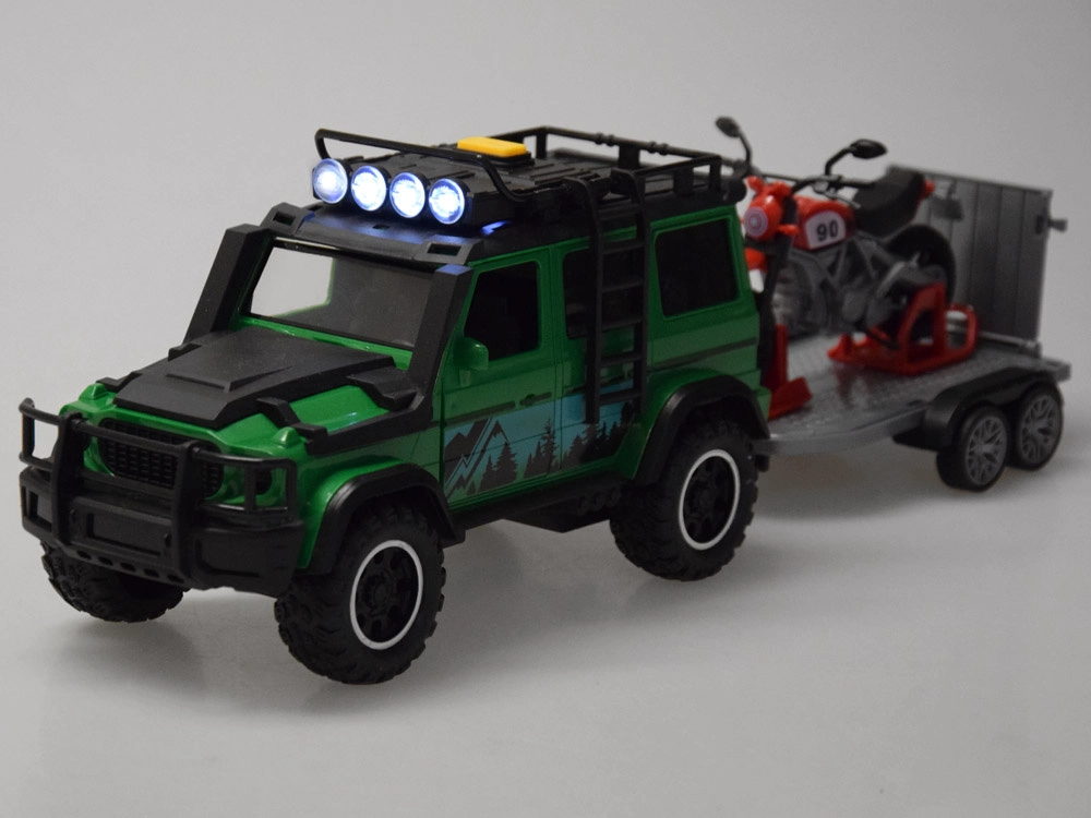Przygodowy zestaw dla małych kierowców: zielony samochód terenowy z odłączaną przyczepą–platformą oraz czerwonym sportowym motocyklem. Auto oferuje efekty świetlne i dźwiękowe, otwierane drzwi i gumowe koła dla płynnej jazdy. Przyczepa ma składaną tylną rampę ułatwiającą załadunek i bezpieczny transport motocykla. Idealne do kreatywnej zabawy i przewozu innych ulubionych zabawek.