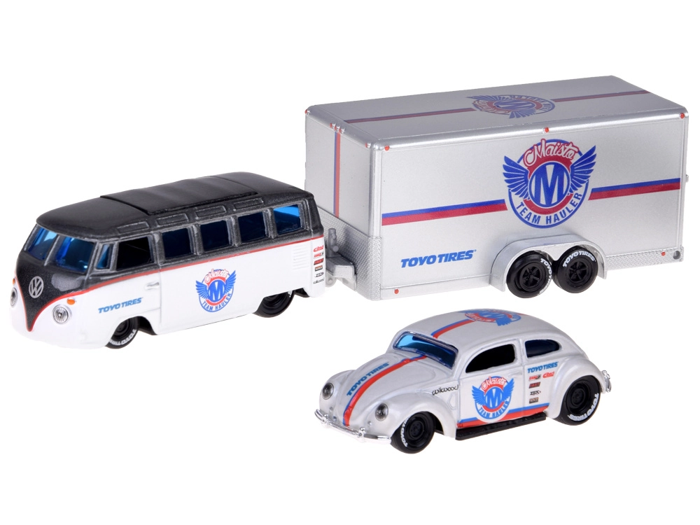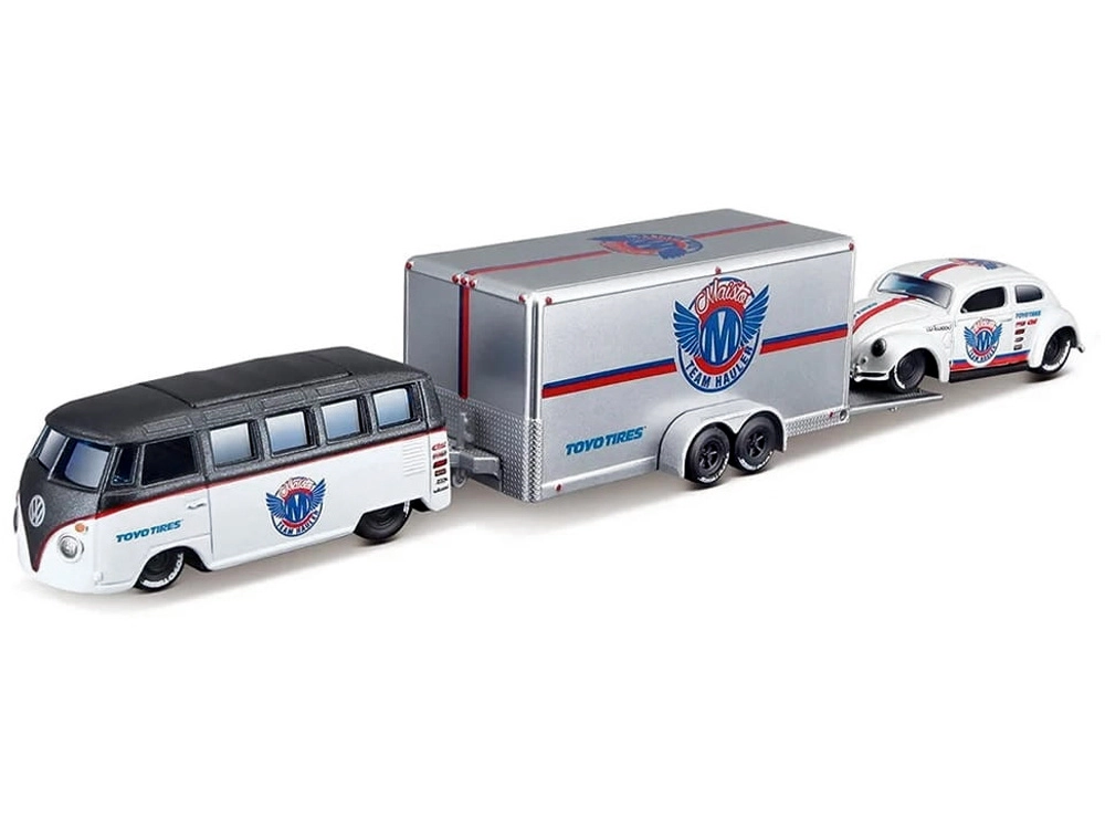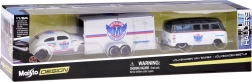 Odkryj ponadczasowy design klasycznych aut w precyzyjnym wykonaniu marki Maisto. Zestaw w eleganckim biało‑srebrnym wykończeniu oferuje metalowe karoserie modeli, plastikowe podwozia dla lekkości oraz płynną jazdę po różnych powierzchniach dzięki gumowym kołom. Beetle wygodnie mieści się na dołączonej przyczepie, więc możesz cieszyć się zarówno autentycznym transportem, jak i efektowną ekspozycją w kolekcji.