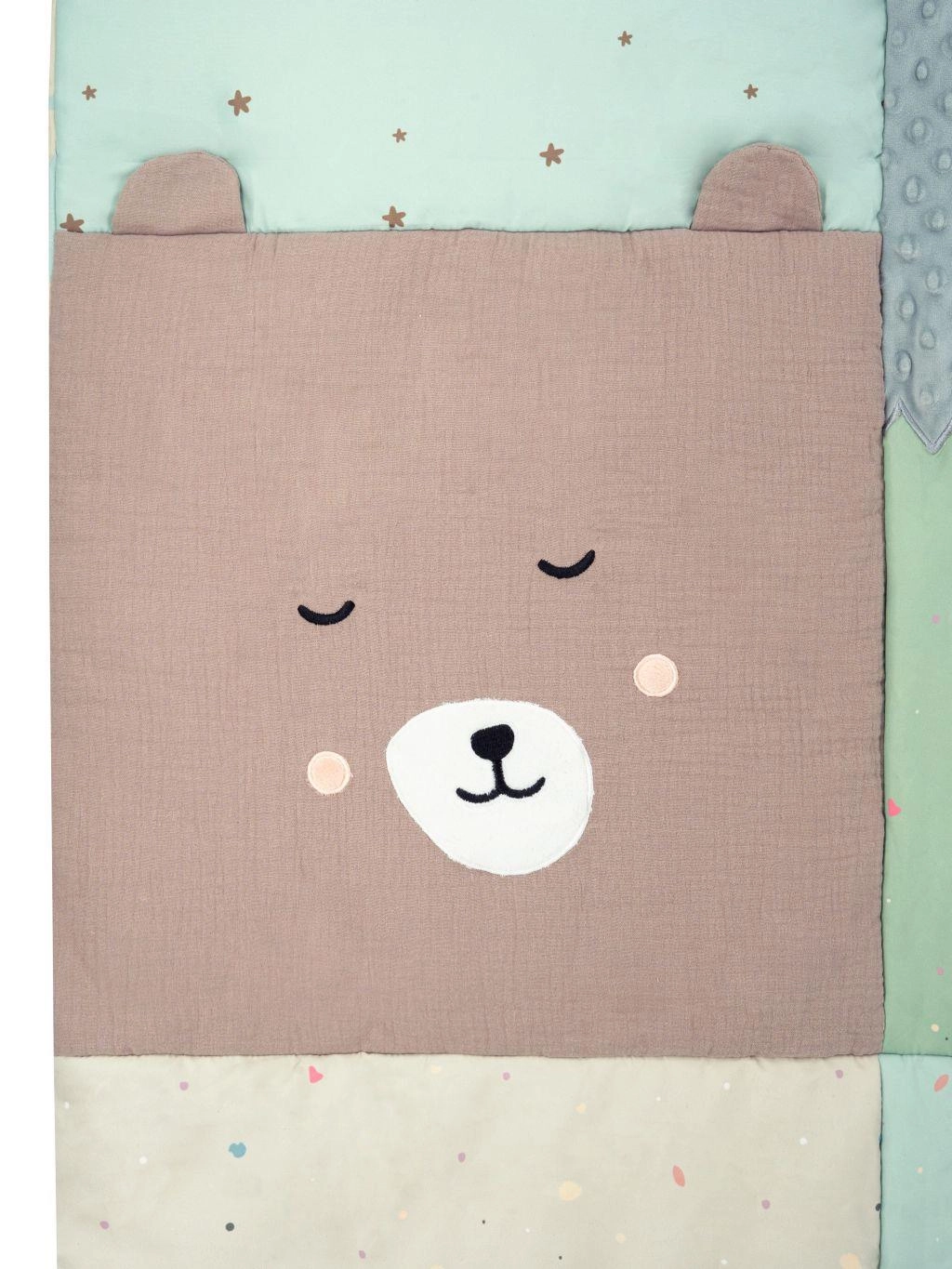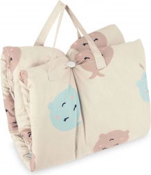 Praktyczna konstrukcja pozwala złożyć matę w torbę i zabezpieczyć guzikami – łatwo zabierzesz ją na piknik, do parku lub na plażę. Delikatne, stonowane kolory nie rozpraszają i pomagają dziecku dostrzegać poszczególne elementy, takie jak zwierzątka i urocze misiaki MoMi. Produkt spełnia normy EN 71-1/2/3 i jest odpowiedni dla dzieci od urodzenia.