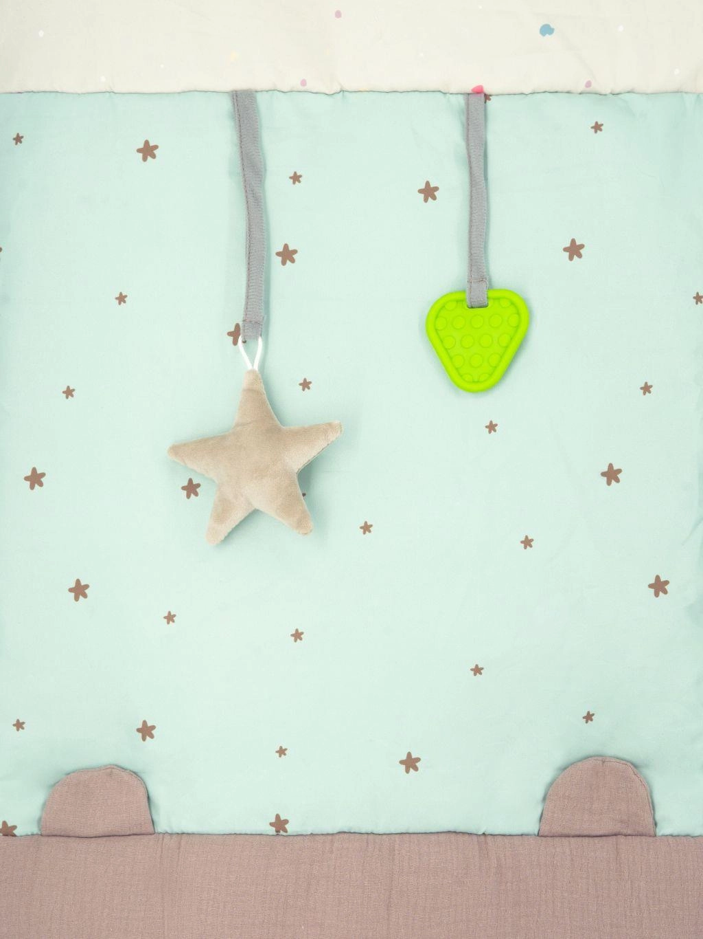 Zintegrowane lusterko, szeleszczące elementy, piszczałki, gryzak i miękkie aplikacje wspierają wzrok, słuch oraz małą motorykę od urodzenia.