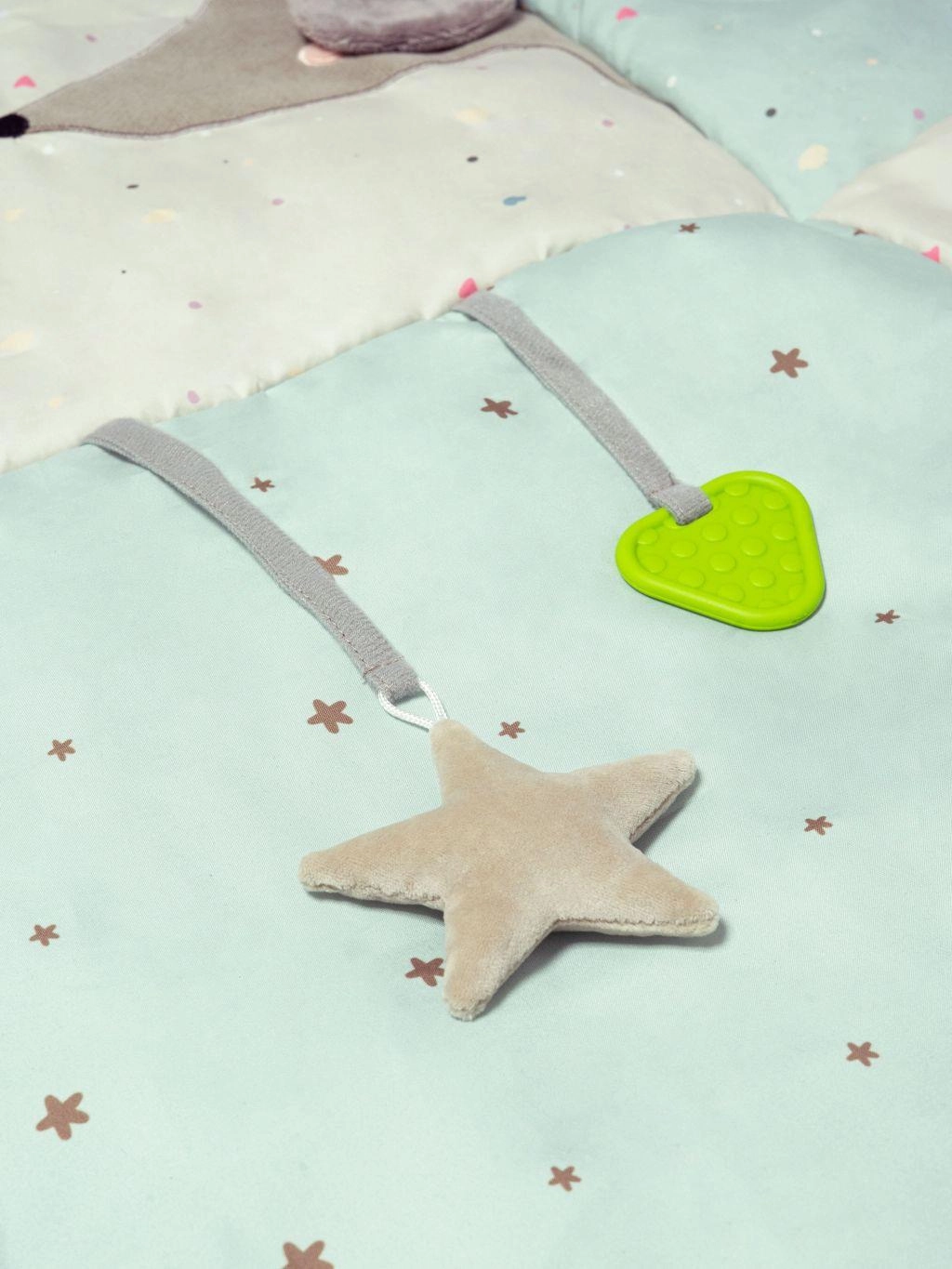 - Bogate wyposażenie sensoryczne – lusterko w baloniku, piszczący nosek misia, szeleszczące ucho pieska, gryzak i miękkie pluszaki.