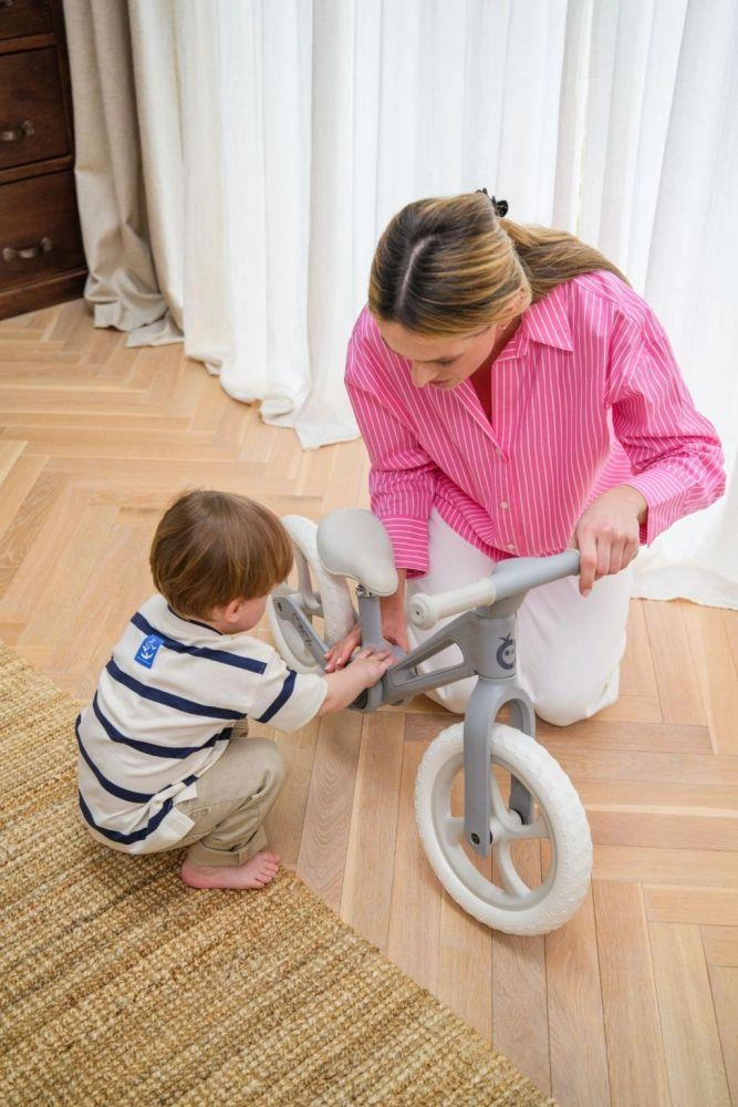 Dzięki szerokiemu zakresowi regulacji siodełka rowerek rośnie razem z dzieckiem. Bezdętkowe koła EVA 12" nie ulegają przebiciu i zapewniają cichą, stabilną jazdę po chodniku i w domu. Dla większego bezpieczeństwa są antypoślizgowe chwytniki oraz brak blokady kierownicy dla naturalnego sterowania bez niespodziewanych zacięć.