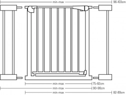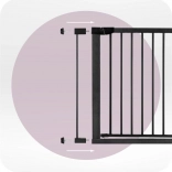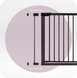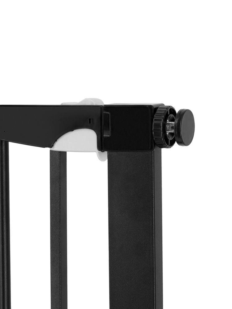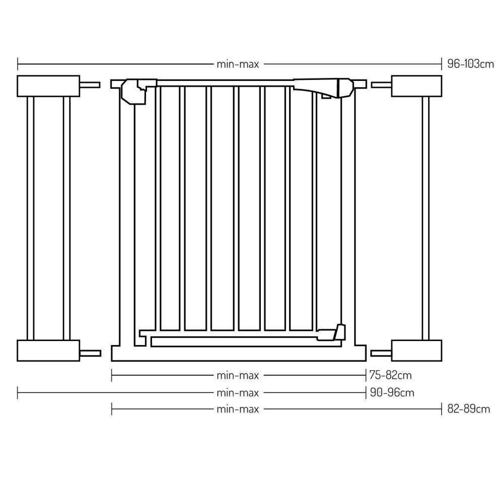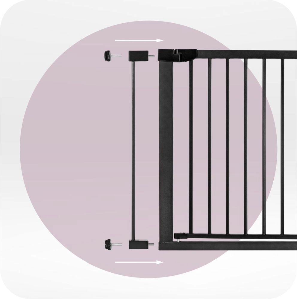 Podstawowa szerokość 75–82 cm oraz dołączone przedłużki 7 cm i 14 cm umożliwiają rozszerzenie aż do 103 cm. Barierka otwiera się w obu kierunkach, ma praktyczną blokadę, a po otwarciu do 90° pozostaje w pozycji otwartej dla wygodnego przejścia. Podwójny system blokady uniemożliwia dzieciom samodzielne otwarcie.