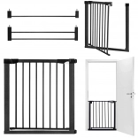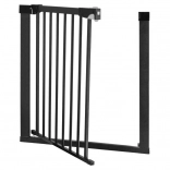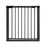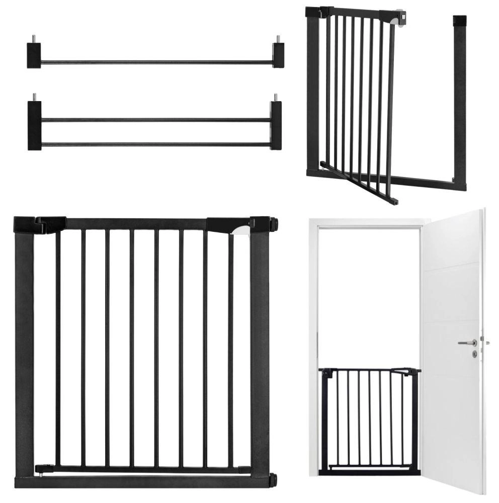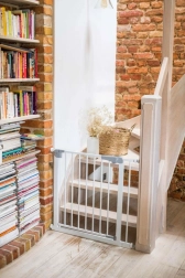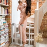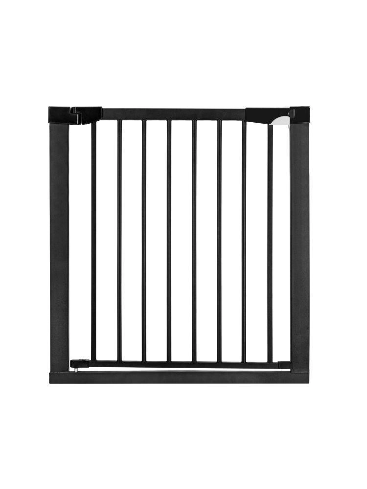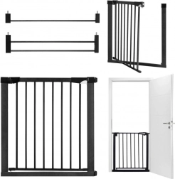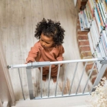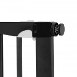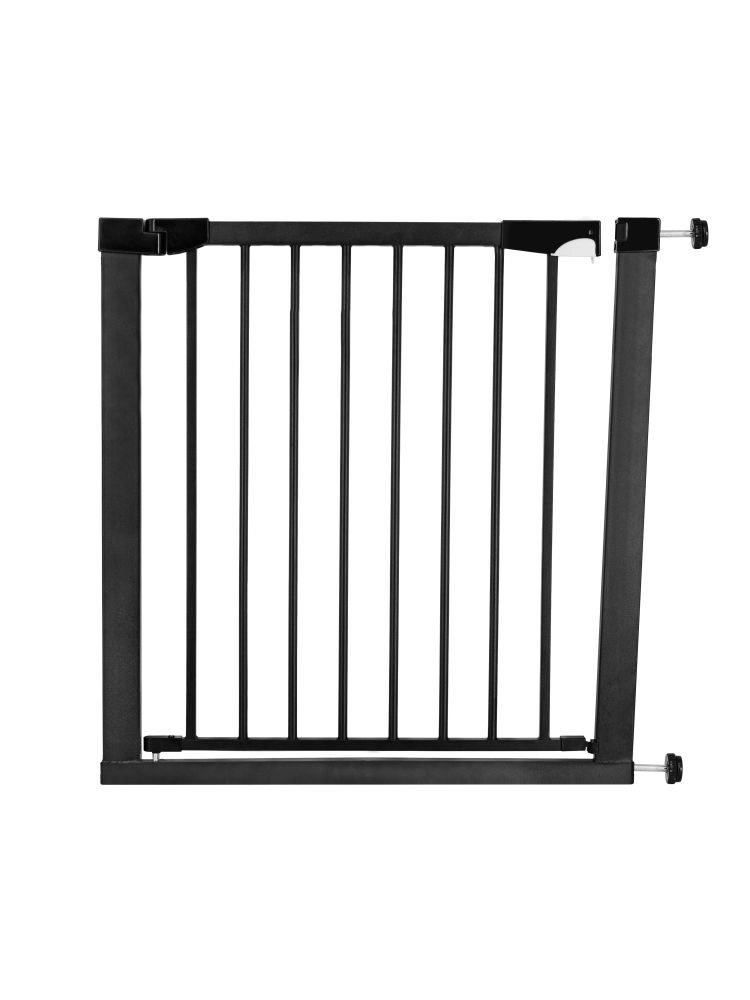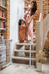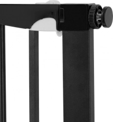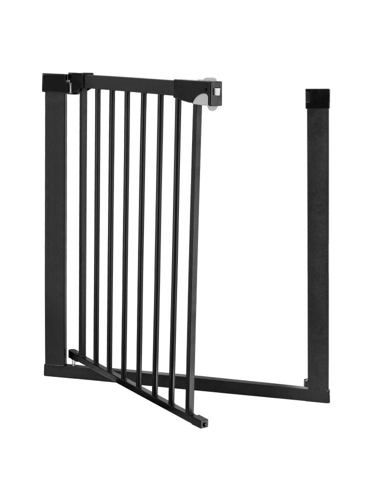 Podstawowa szerokość 75–82 cm oraz dołączone przedłużki 7 cm i 14 cm umożliwiają rozszerzenie aż do 103 cm. Barierka otwiera się w obu kierunkach, ma praktyczną blokadę, a po otwarciu do 90° pozostaje w pozycji otwartej dla wygodnego przejścia. Podwójny system blokady uniemożliwia dzieciom samodzielne otwarcie.
