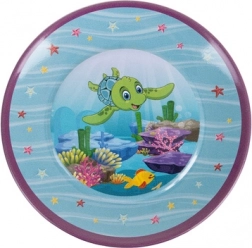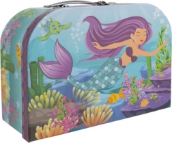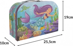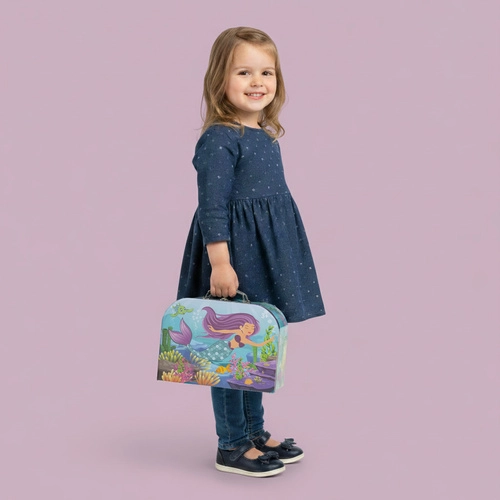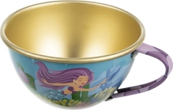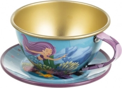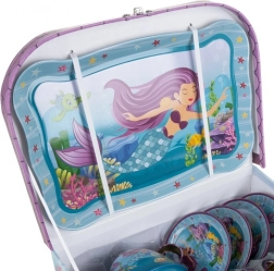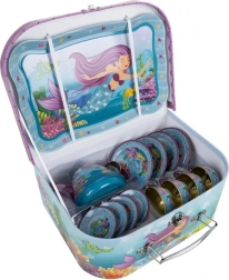 W komplecie czajniczek, filiżanki, talerzyki i taca do serwowania w stonowanych morskich barwach z ilustracjami syren, koralowców i rybek. Praktyczna metalowa walizeczka zapewnia porządek, łatwe przenoszenie i ochronę całego zestawu – idealny jako prezent dla dzieci od 3 lat.