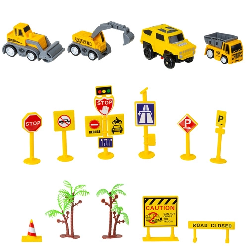 Koparka, walec i wywrotka wraz ze znakami drogowymi, pachołkami, barierkami i palmami tworzą autentyczny świat budowy na wiele godzin pomysłowej zabawy.