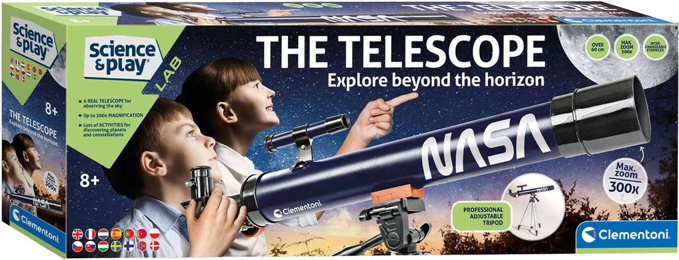 Dziecięcy teleskop CLEMENTONI Science & Play to doskonałe wprowadzenie do świata astronomii. Zapewnia jasny obraz dzięki obiektywowi o średnicy 50 mm oraz dwóm wymiennym okularom (6 mm i 12 mm), z którymi dzieci łatwo zbadają Księżyc, gwiazdy i podstawowe obiekty nocnego nieba. Inspiracja NASA oraz nacisk na edukację sprawiają, że to idealny wybór dla małych odkrywców.