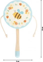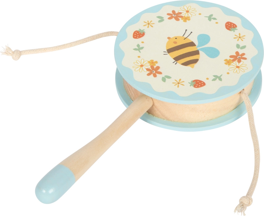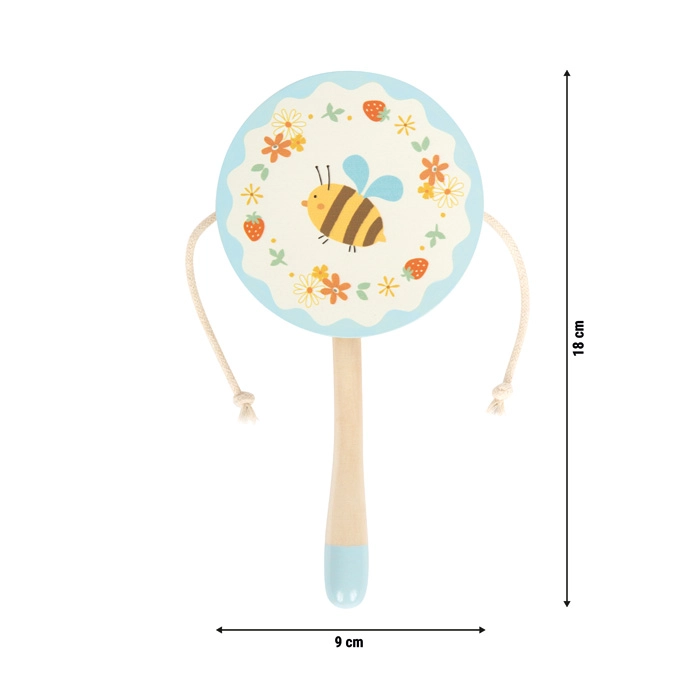 Ten drewniany bębenek obrotowy to idealny pierwszy instrument dla małych muzyków. Dzięki kompaktowym wymiarom doskonale leży w dziecięcej dłoni, a podczas zabawy wspiera naturalny rozwój poczucia rytmu i koordynacji oko–ręka. Wesoły nadruk z pszczółką i kwiatami nadaje zabawce figlarny wygląd, który zachęca dzieci do dalszego odkrywania świata dźwięków.