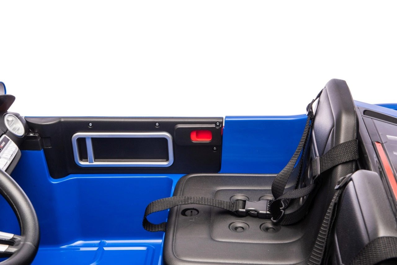 Komfort jazdy podnoszą miękkie koła EVA 25 × 9 cm oraz tylne amortyzatory, a przednie światła LED poprawiają widoczność. Dwa oddzielne siedzenia z ekoskóry z pasami bezpieczeństwa wygodnie mieszczą dwoje dzieci. Wnętrze uzupełnia panel audio z radiem FM, MP3, Bluetooth, USB oraz kierownica z klaksonem.