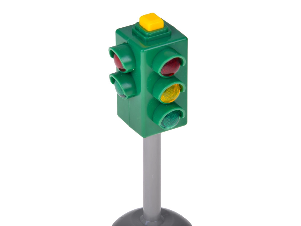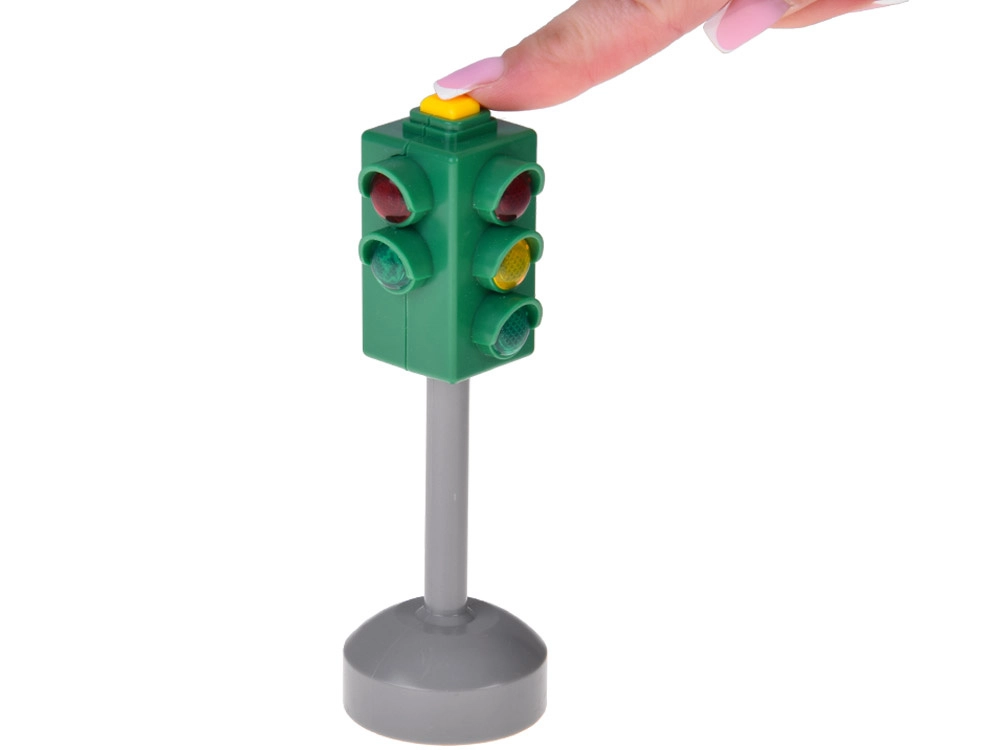 Semafor z trzema kolorami świateł (czerwone, żółte, zielone) oraz dźwiękiem symuluje prawdziwy ruch. Idealny do nauki bezpiecznego przechodzenia i jazdy.