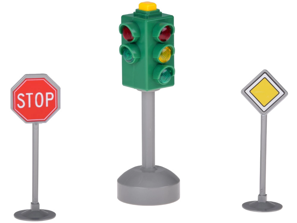 Zabawny i edukacyjny zestaw dla małych kierowców: działająca zabawka semafor ze światłem i dźwiękiem uzupełniona o 2 znaki drogowe (STOP i Ustąp pierwszeństwa przejazdu). Dzieci, bawiąc się autkami, przećwiczą zasady ruchu drogowego i rozwiną wyobraźnię oraz motorykę.