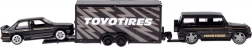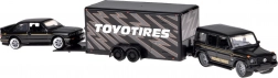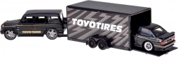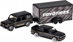 Odkryj ponadczasowy duet, który ucieszy kolekcjonerów i miłośników aut: robustny MERCEDES‑BENZ G (1988) i legendarny BMW M3 E30 w jednolitej czarnej kolorystyce. Metalowe nadwozie z precyzyjnymi liniami, gumowe koła oraz czyste nadruki detali nadają modelom autentyczny wygląd. Funkcjonalna przyczepa z rampą najazdową pozwala bezpiecznie „przewieźć” BMW za MERCEDESEM, co zwiększa grywalność i atrakcyjność ekspozycji.