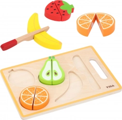 Drewniany zestaw owoców do krojenia VIGA to świetne uzupełnienie dziecięcej kuchni. Kolorowe, solidne kawałki owoców trzymają się razem dzięki rzepom, które podczas krojenia dają przyjemny opór i realistyczne wrażenie. Dzieci mogą bezpiecznie ćwiczyć umiejętności kucharskie, jednocześnie rozwijając zręczność i wyobraźnię.