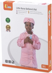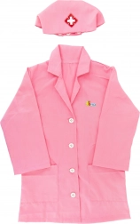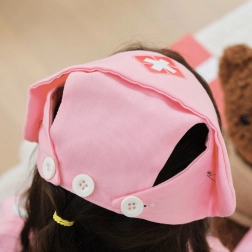 W zestawie znajduje się pasujący różowy czepek z wyraźnym krzyżem, który podkreśla rolę małej pielęgniarki.