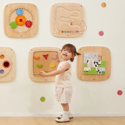 Dzięki solidnemu drewnianemu wykonaniu i zaokrąglonym krawędziom zabawka jest trwała i bezpieczna w codziennym użytkowaniu. Montaż na ścianie oszczędza przestrzeń i wspiera uporządkowane otoczenie bez luźnych elementów na podłodze.