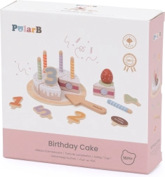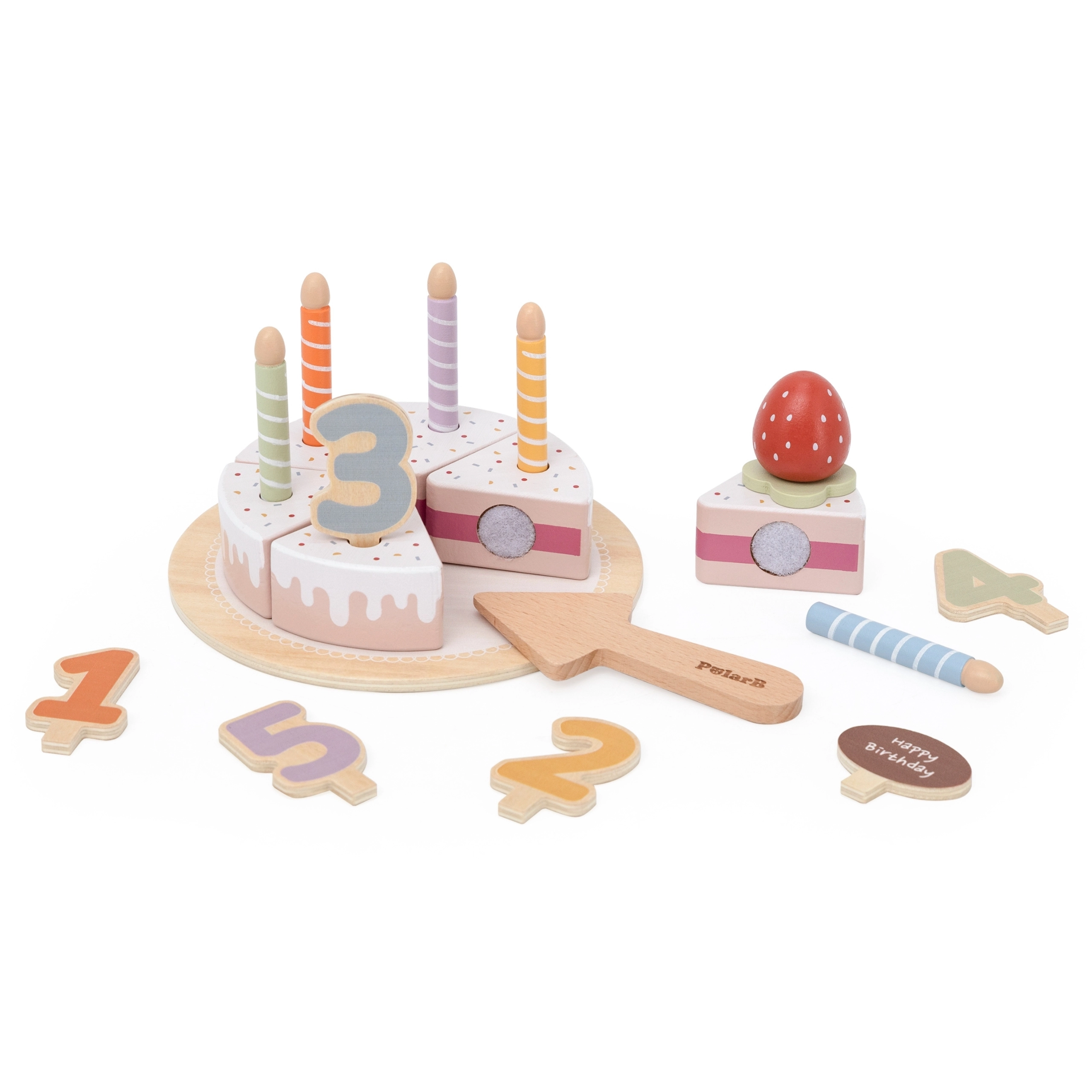 - Zawartość zestawu: 6 kawałków tortu, 5 drewnianych cyfr, zdejmowane świeczki, truskawkowa dekoracja, tabliczka „Happy Birthday”, taca i drewniana łopatka.
